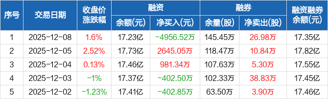 长江证券:融资净偿还4956.52万元,融资余额17.23亿元(12-08)