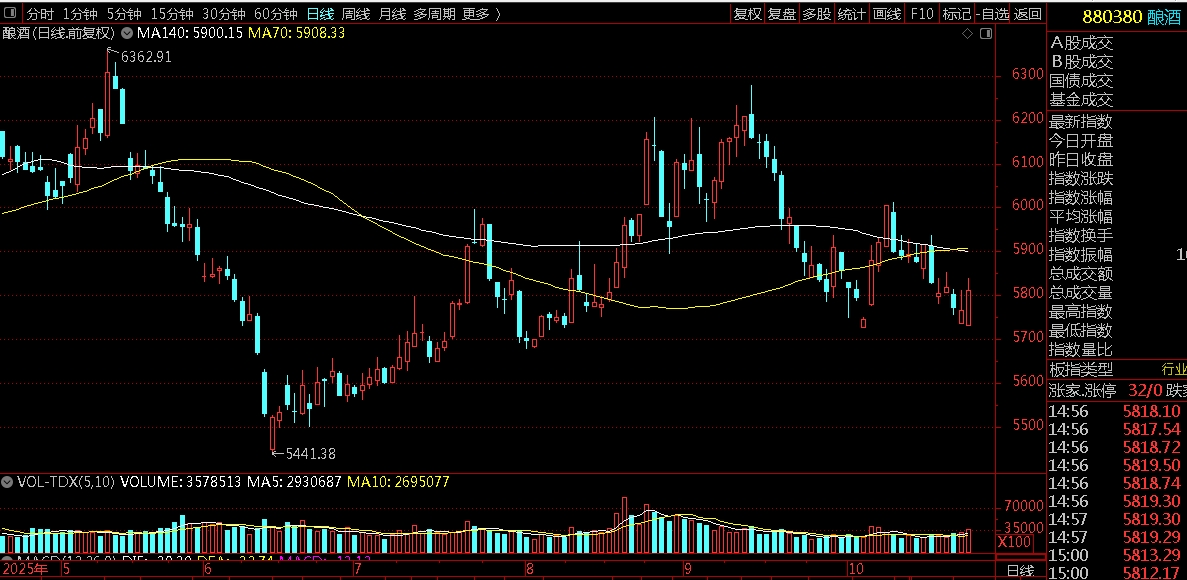 酿酒板块跌破了所有均线,处于弱势状态,暂时先不碰,看能不能收上均线以后再说。收不上来均线,就走阴跌模式,堪称牛市熊股。