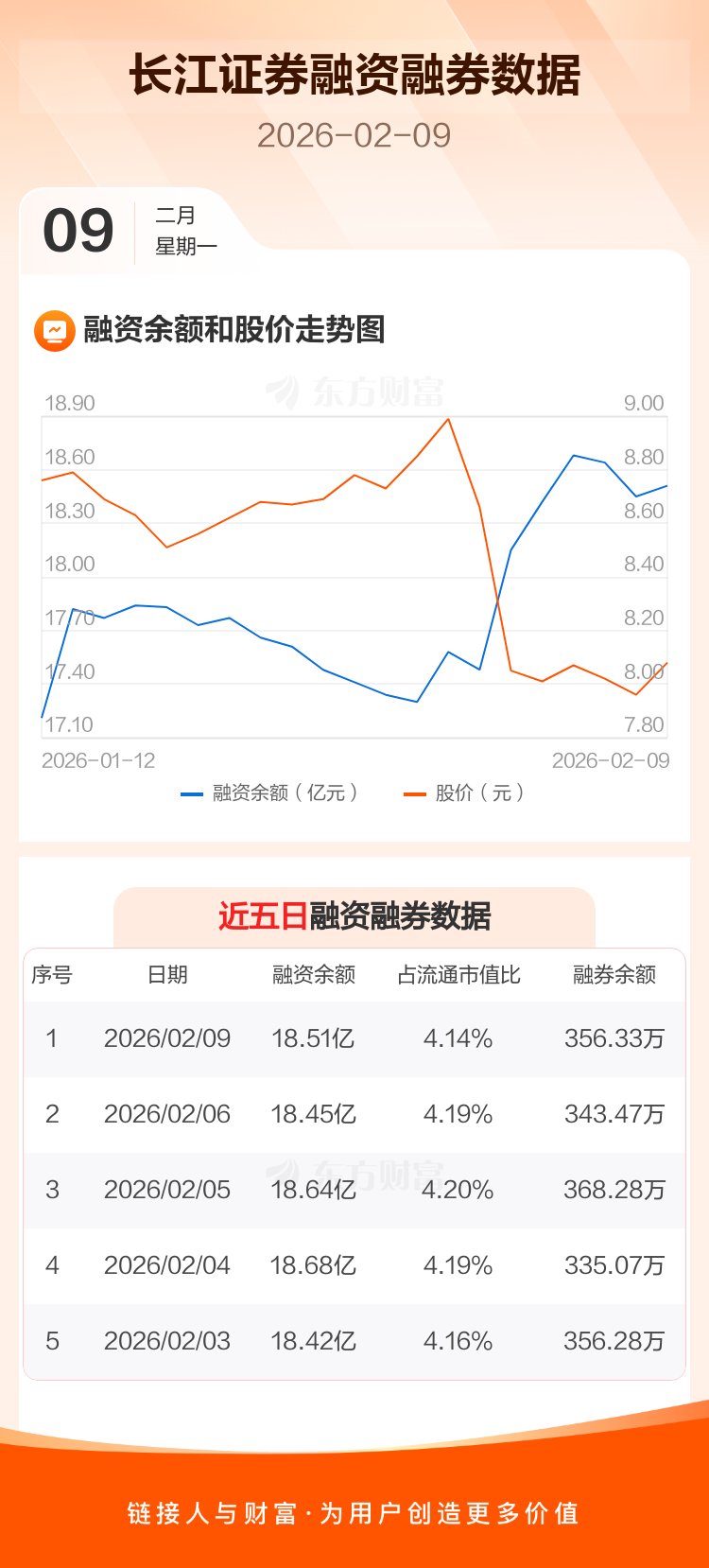 交易所最新数据显示,长江证券于2026年2月9日获融资买入8318.99万元,融资偿还7718.58万元,当日融资净买入600.4万元。目前,该股融资余额18.51亿,占流通市值比例为4.14%。