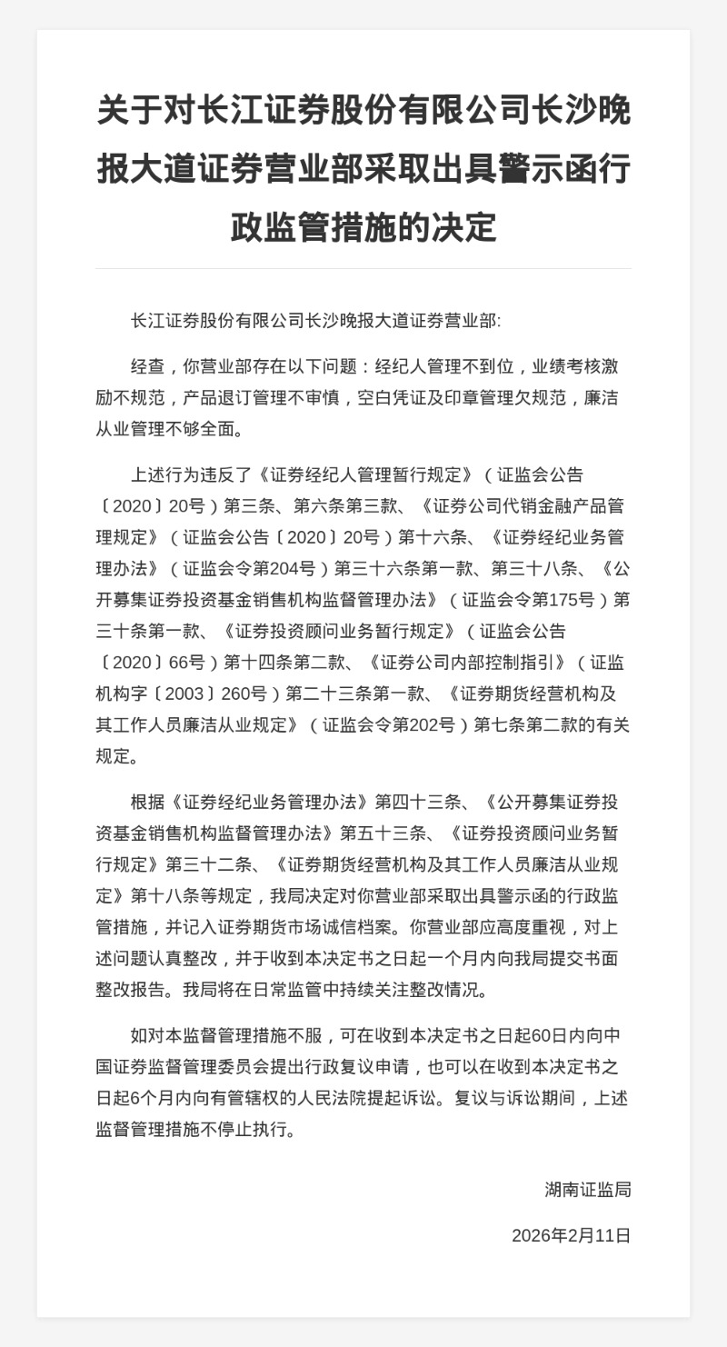 长江证券长沙晚报大道营业部被出具警示函,涉多项违规行为