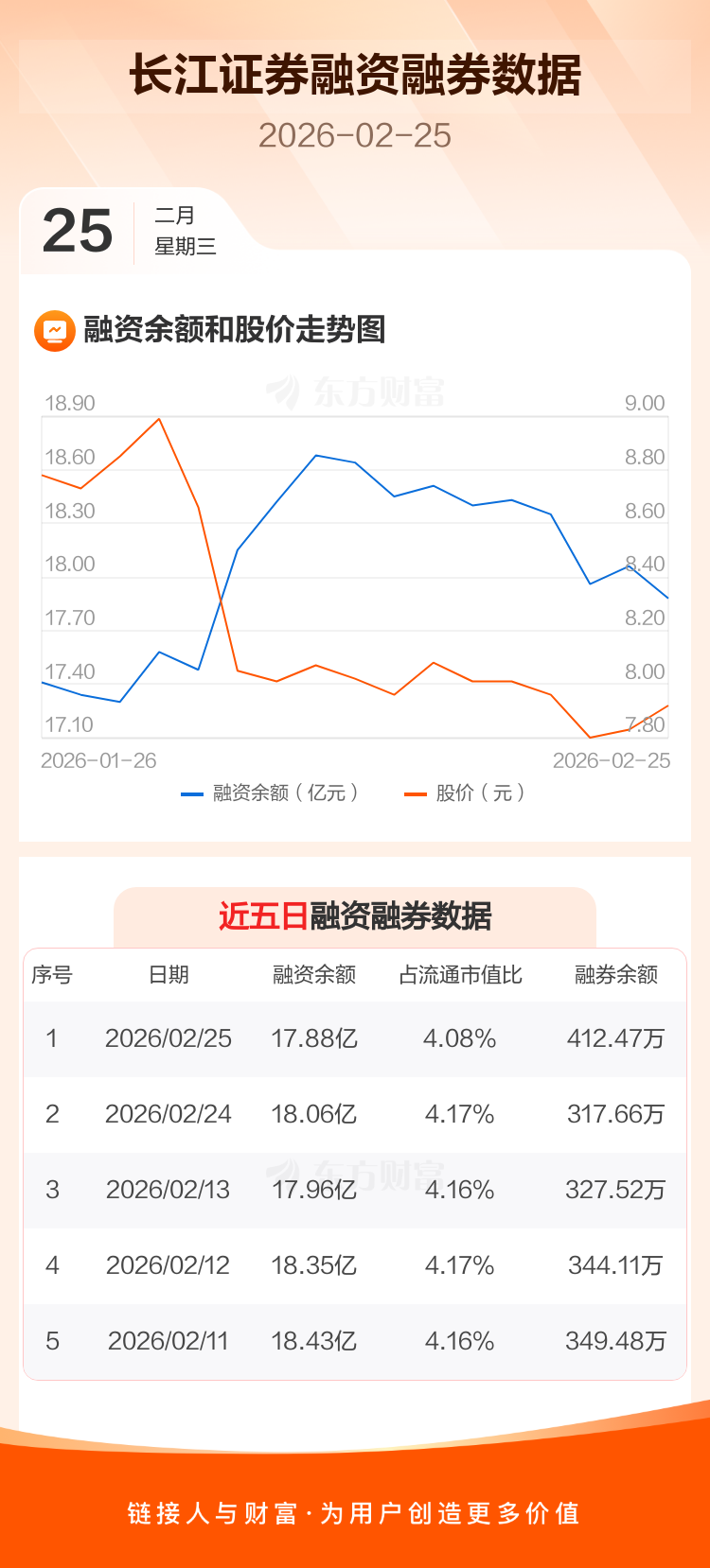 交易所最新数据显示,长江证券于2026年2月25日获融资买入5682.16万元,融资偿还7509.33万元,当日融资净偿还1827.18万元。目前,该股融资余额17.88亿,占流通市值比例为4.08%。