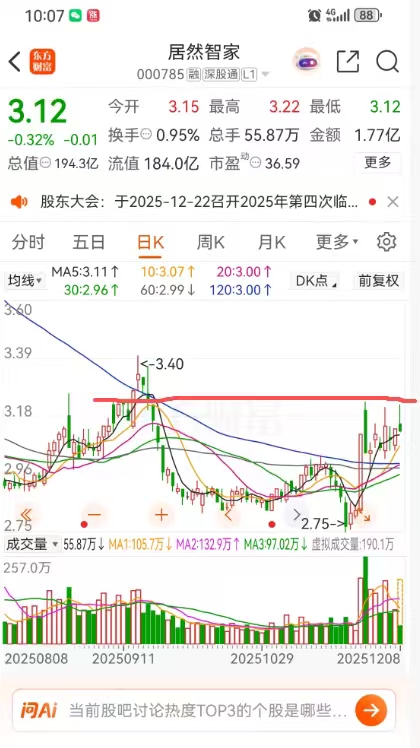 $居然智家(SZ000785)$ 3.2附近这个压力位强的很,突了三次都没站稳,不爆量上去,估计还得有的摩擦了