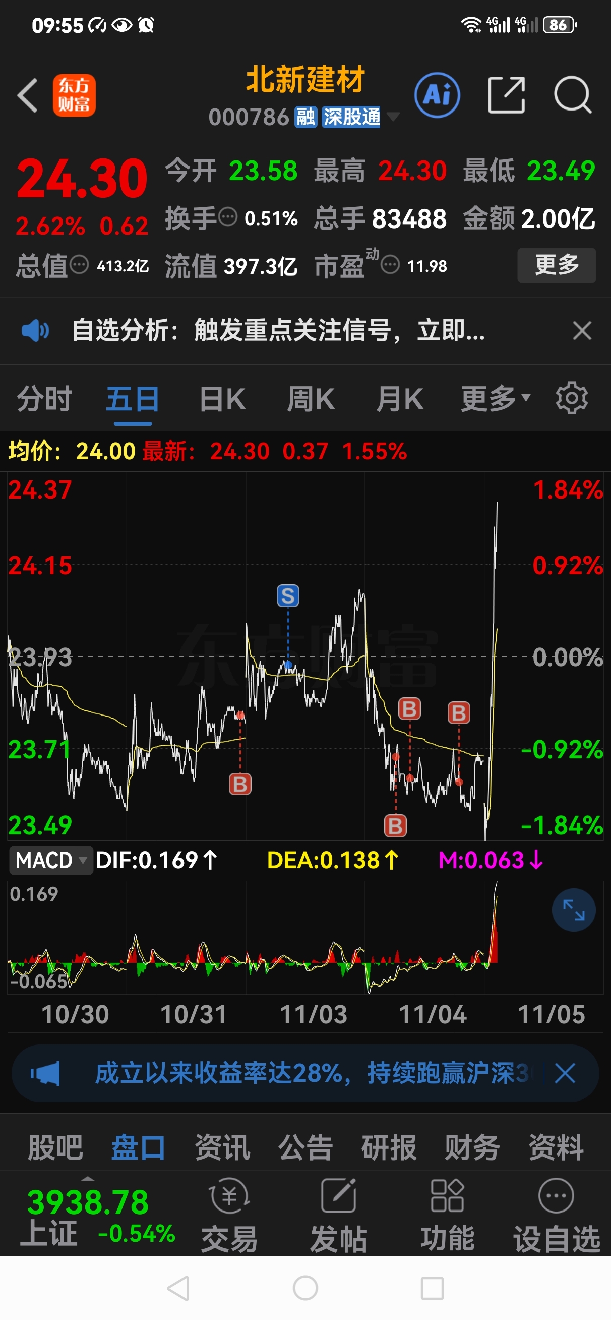 $北新建材(SZ000786)$ 大盘调整,这股有启动的迹象,进了一些