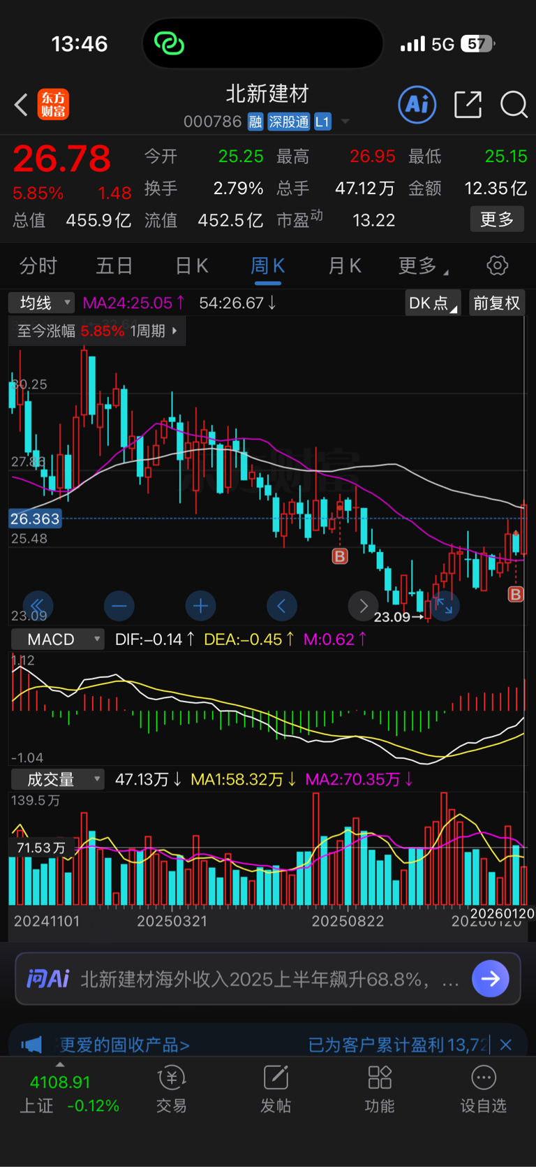 真心不敢动,8月份建仓,上周加了不到一倍的仓位,总共仓位不重,成本26.37,今天已经回本,但这个位置看日线看周线再结合大盘最近处在风格切换的节点,真心不敢动啊!