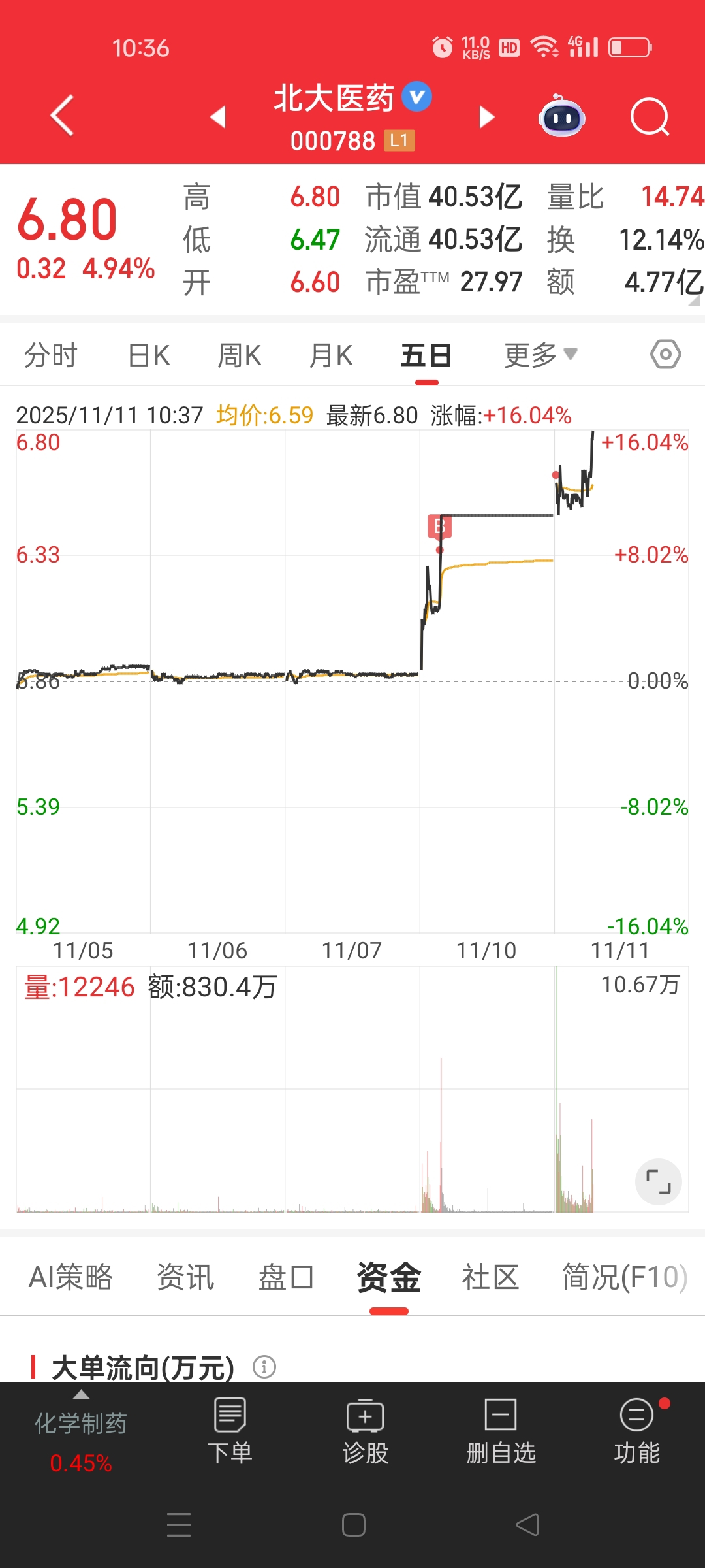 $北大医药(SZ000788)$ 主力洗了一上午想把我洗出去。可惜我不会走的。明天继续买。