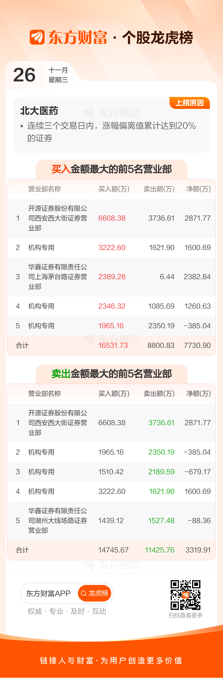 交易所2025年11月26日公布的交易公开信息显示,北大医药因成为连续三个交易日内,涨幅偏离值累计达到20%的证券上榜。北大医药当日收报7.3元,涨跌幅9.94%,换手率15.22%,成交额6.55亿。异常期间11月24日至11月26日,期间涨幅25.00%,累计偏离值22.35%,区间成交额10.94亿。
