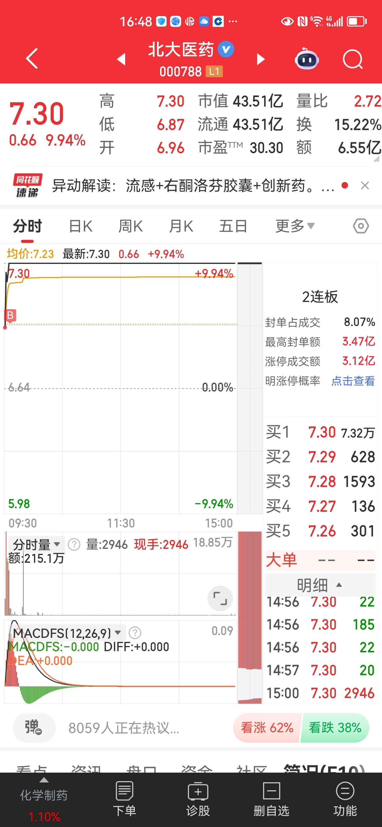 $北大医药(SZ000788)$ 好票,一早打板进的