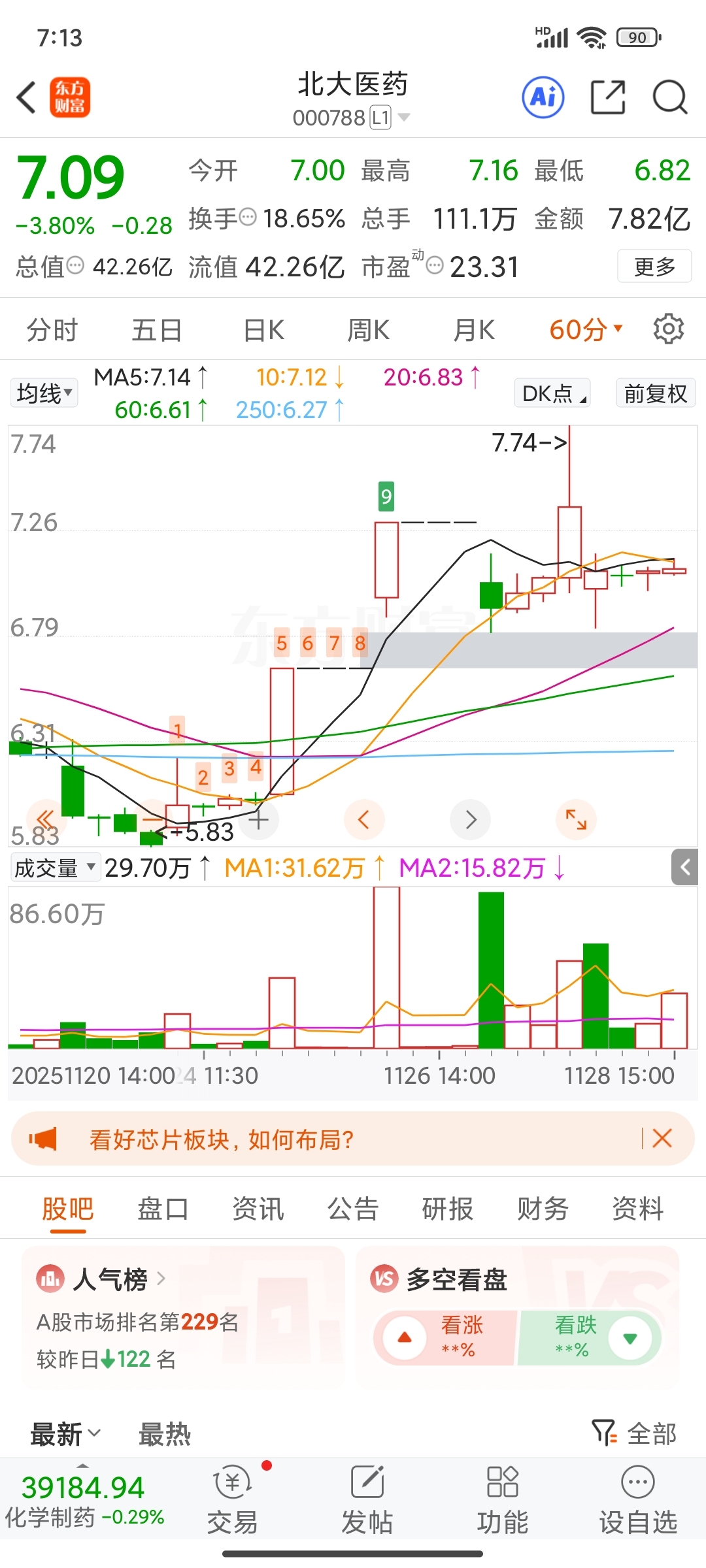 $北大医药(SZ000788)$ 60分钟的分时图,像不像老鸭头。