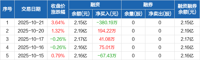 融资方面,当日融资买入805.93万元,融资偿还1186.12万元,融资净偿还380.19万元。融券方面,融券卖出0股,融券偿还0股,融券余量0股,融券余额0元。融资融券余额合计2.15亿元。