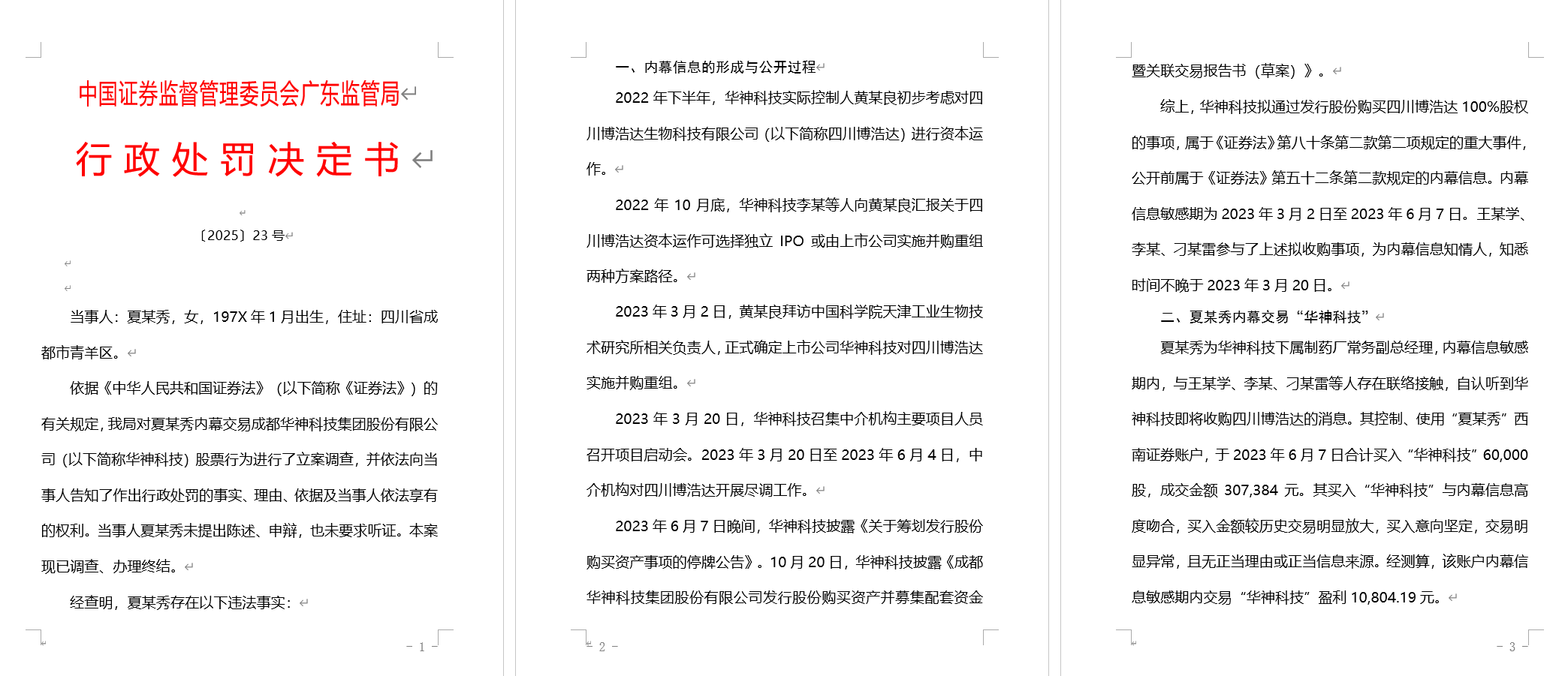 夏某秀为华神科技下属制药厂常务副总经理,内幕信息敏感期内,与王某学、李某、刁某雷等人存在联络接触,自认听到华神科技即将收购四川博浩达的消息。其控制、使用“夏某秀”西南证券账户,于2023年6月7日合计买入“华神科技”60,000股,成交金额307,384元。其买入“华神科技”与内幕信息高度吻合,买入金额较历史交易明显放大,买入意向坚定,交易明显异常,且无正当理由或正当信息来源。经测算,该账户内幕信息敏感期内交易“华神科技”盈利10,804.19元。