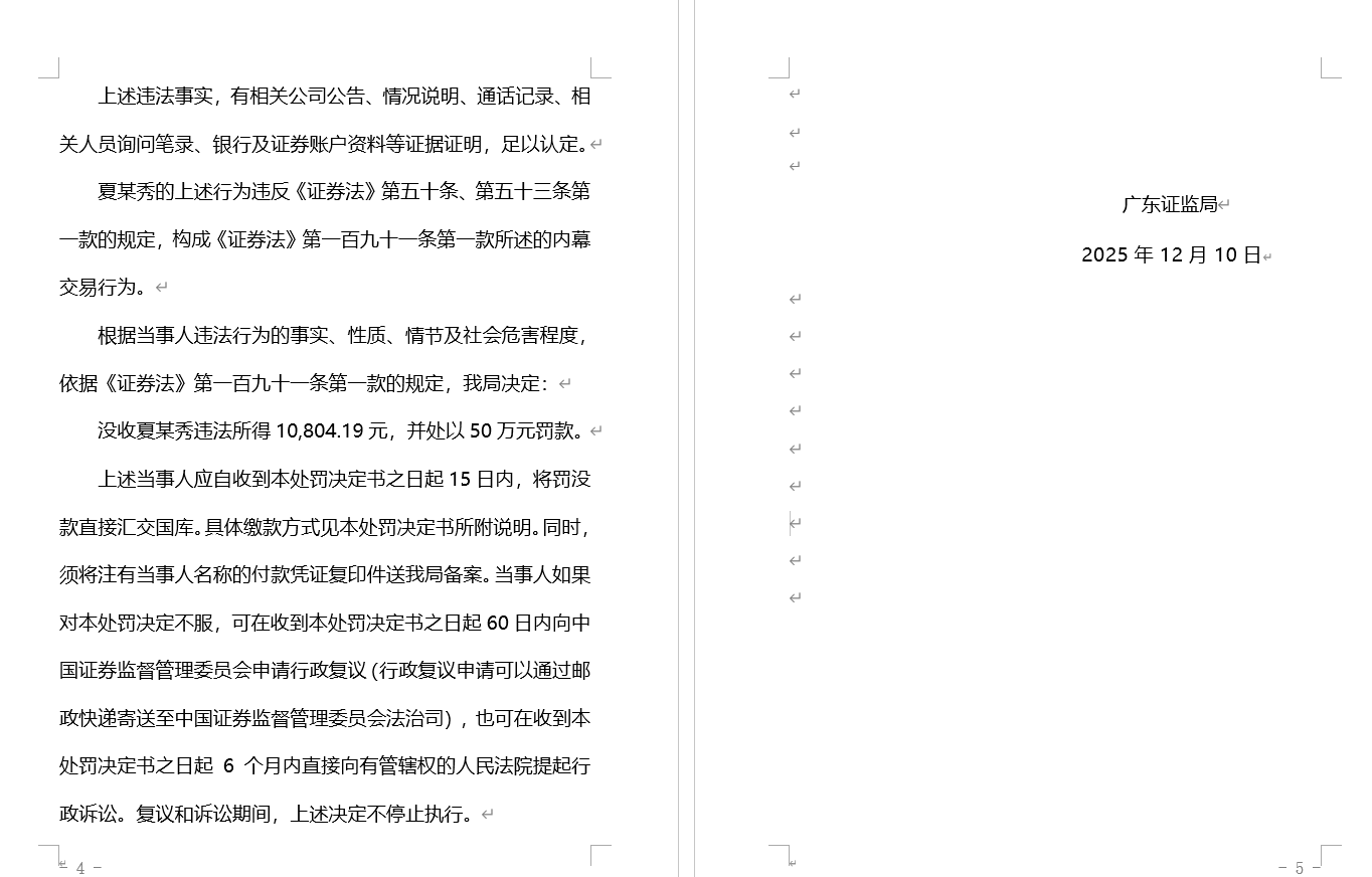 蓝鲸新闻12月20日讯,近日,广东证监局发布了行政处罚决定书,剑指夏某秀。