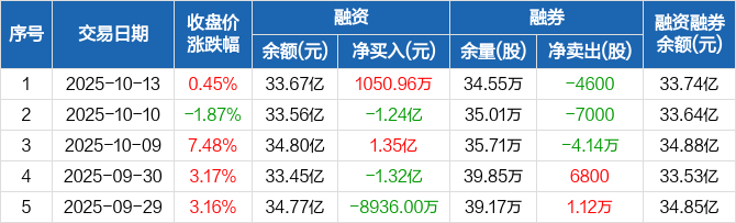 融资方面,当日融资买入2.69亿元,融资偿还2.58亿元,融资净买入1050.96万元。融券方面,融券卖出1.41万股,融券偿还1.87万股,融券余量34.55万股,融券余额763.21万元。融资融券余额合计33.74亿元。