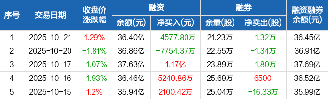 融资方面,当日融资买入9760.07万元,融资偿还1.43亿元,融资净偿还4577.8万元。融券方面,融券卖出1万股,融券偿还2.32万股,融券余量21.23万股,融券余额466.64万元。融资融券余额合计36.45亿元。