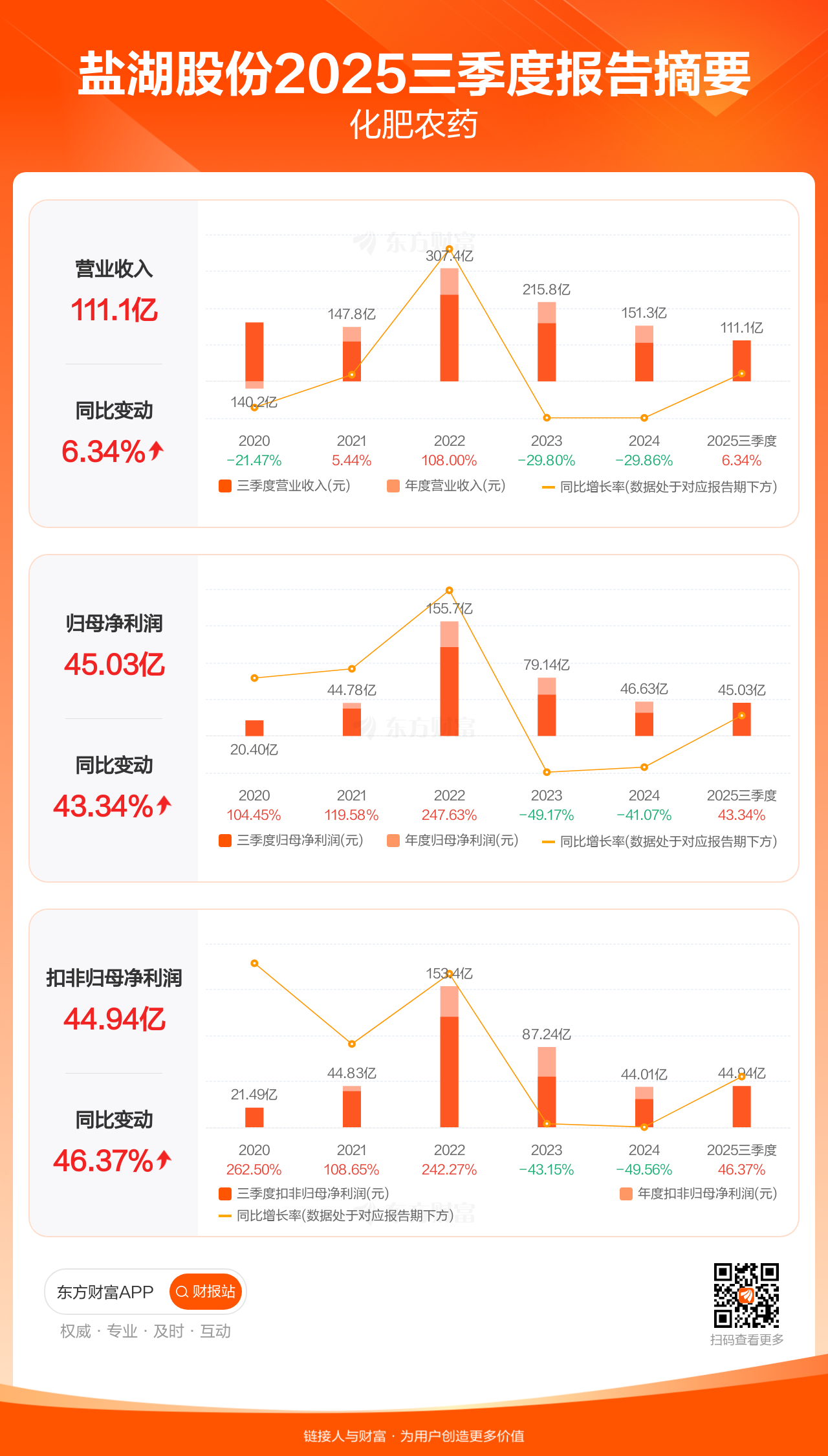 盐湖股份10月25日发布2025年三季报显示,公司前三季实现营业收入111.11亿元,同比增长6.34%;归母净利润45.03亿元,同比增长43.34%;扣非归母净利润44.94亿元,同比增长46.37%