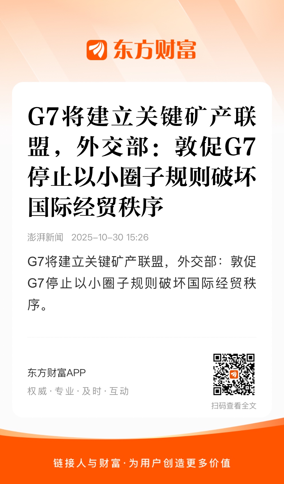 10月30日,外交部发言人郭嘉昆主持例行记者会。据彭博社报道,七国集团(G7)即将宣布建立关键矿产生产联盟,以对抗中国在该市场的主导地位。请问中方对此有何回应?