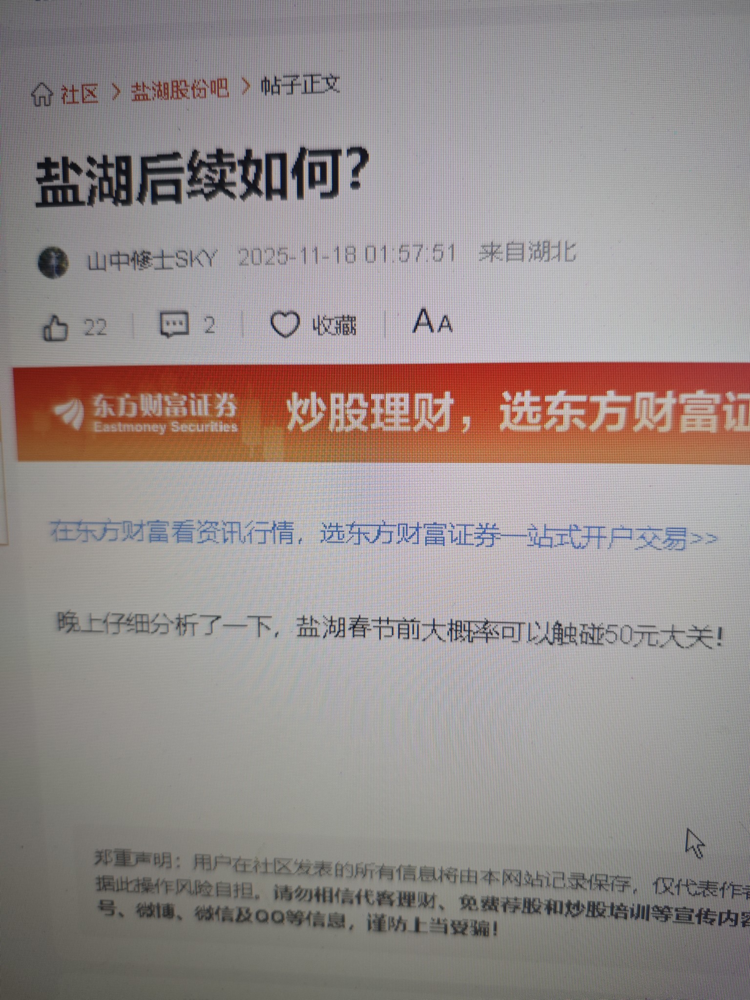 温馨提示: 1.根据《证券法》规定,禁止编造、传播虚假信息或者误导性信息,扰乱证券市场;2.用户在本社区发表的所有资料、言论等仅代表个人观点,与本网站立场无关,不对您构成任何投资建议。用户应基于自己的独立判断,自行决定证券投资并承担相应风险。《东方财富社区管理规定》
