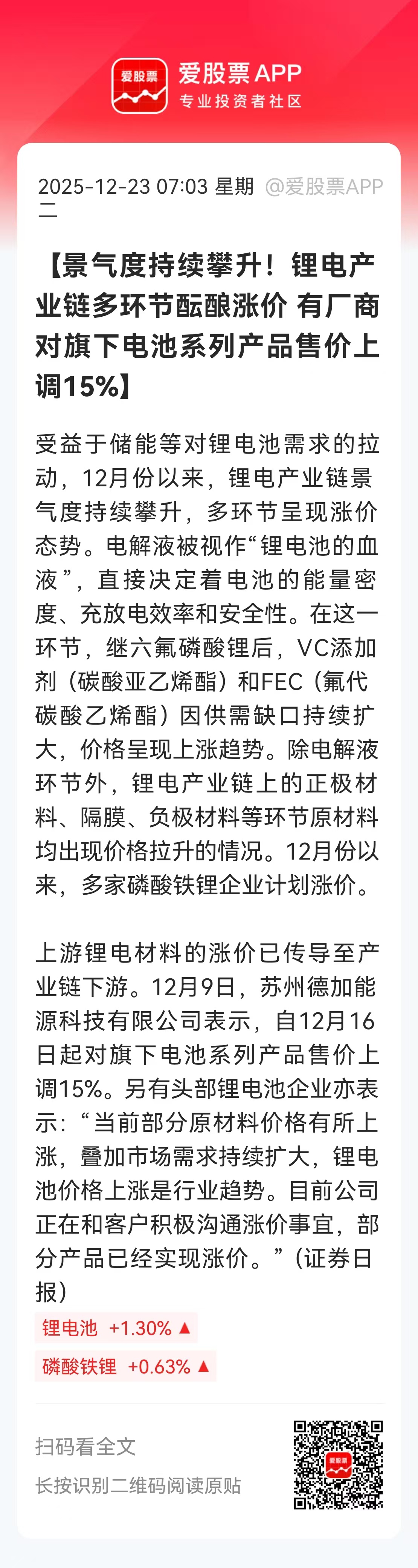 $盐湖股份(SZ000792)$ 2025-12-1722:46 星期三美股异动|锂矿股集体上涨。机构预测储能扩张将推动全球锂市明年供不应求