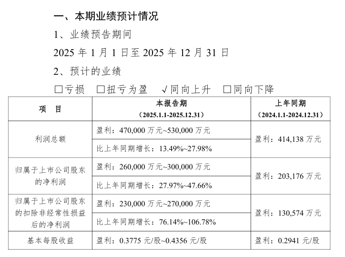 华菱钢铁2025年12月31日披露业绩预告称,预计2025年度实现归属于上市公司股东的净利润26亿元至30亿元,同比增长27.97%至47.66%,归属于上市公司股东的扣除非经常性损益后的净利润为23亿元至27亿元,同比增长76.14%至106.78%。