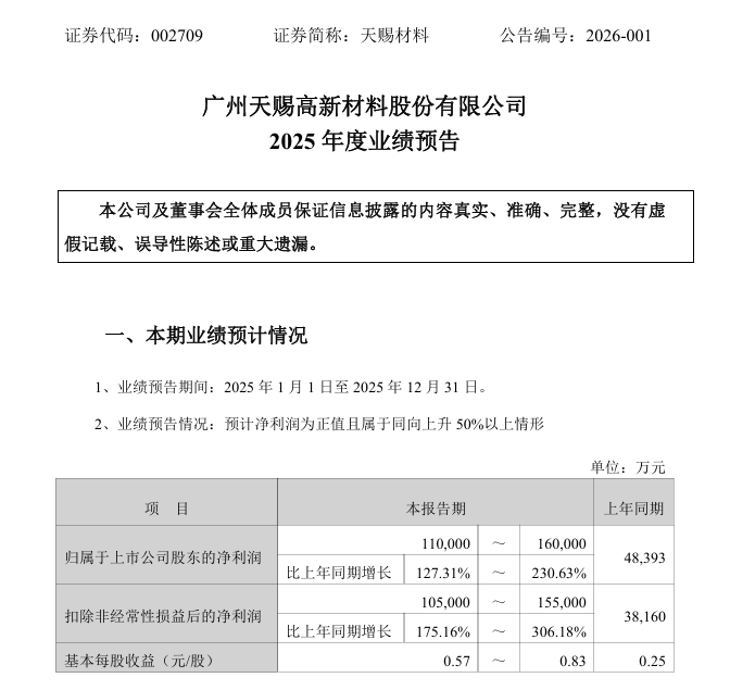 天赐材料也披露业绩预告称,预计2025年度实现归属于上市公司股东的净利润11亿元至16亿元,同比增长127.31%至230.63%,归属于上市公司股东的扣除非经常性损益后的净利润为10.5亿元至15.5亿元,同比增长175.16%至306.18%。