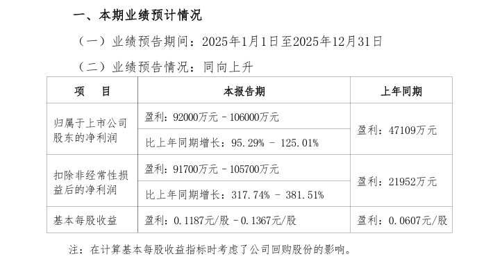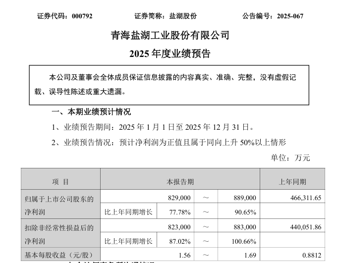 盐湖股份2025年12月31日披露业绩预告称,预计2025年实现归属于上市公司股东的净利润82.9亿元至88.9亿元,同比增长77.78%至90.65%。