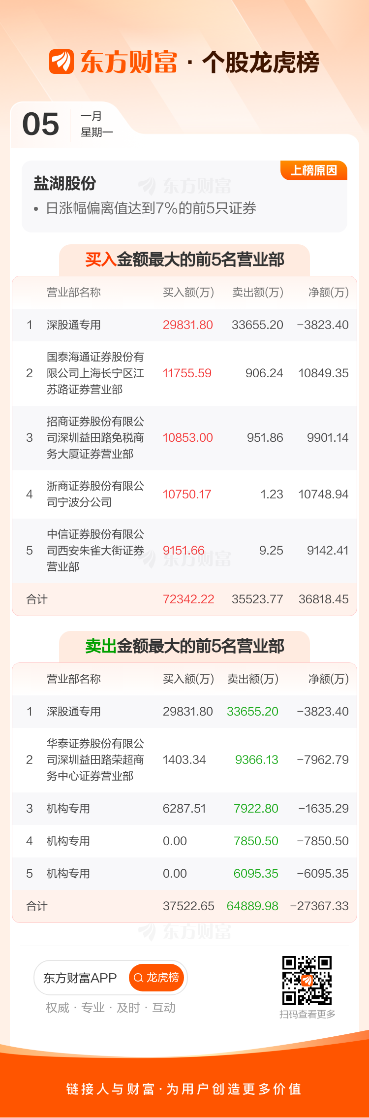 交易所2026年1月5日公布的交易公开信息显示,盐湖股份因成为日涨幅偏离值达到7%的前5只证券上榜。盐湖股份当日收报30.98元,涨跌幅10.01%,偏离值8.00%,换手率3.08%,成交额50.05亿。