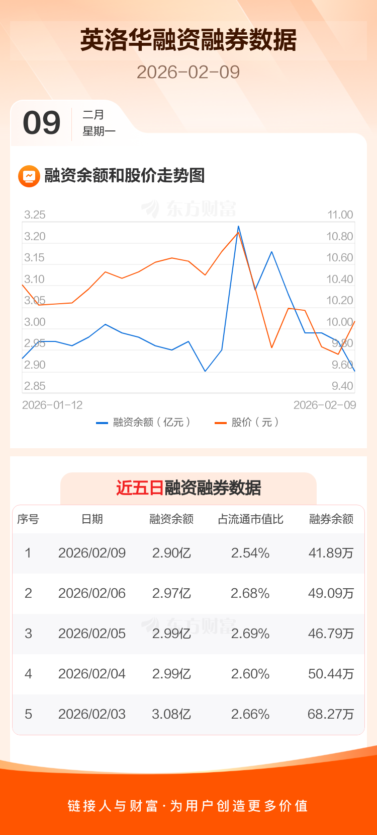 交易所最新数据显示,英洛华于2026年2月9日获融资买入1478.20万元,融资偿还2149.04万元,当日融资净偿还670.84万元。目前,该股融资余额2.90亿,占流通市值比例为2.54%。