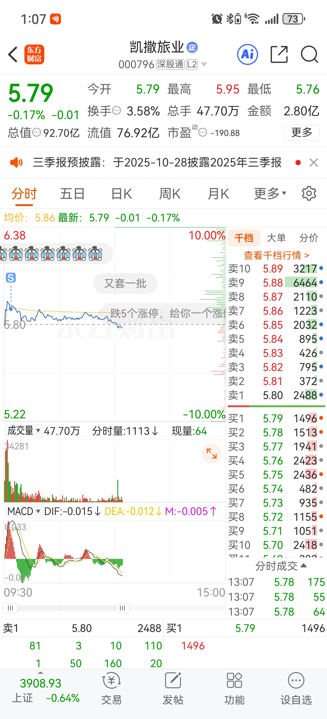 $凯撒旅业(SZ000796)$ 昨天买的今天卖了赚2个点。赶紧下来跌5个点我还要进去