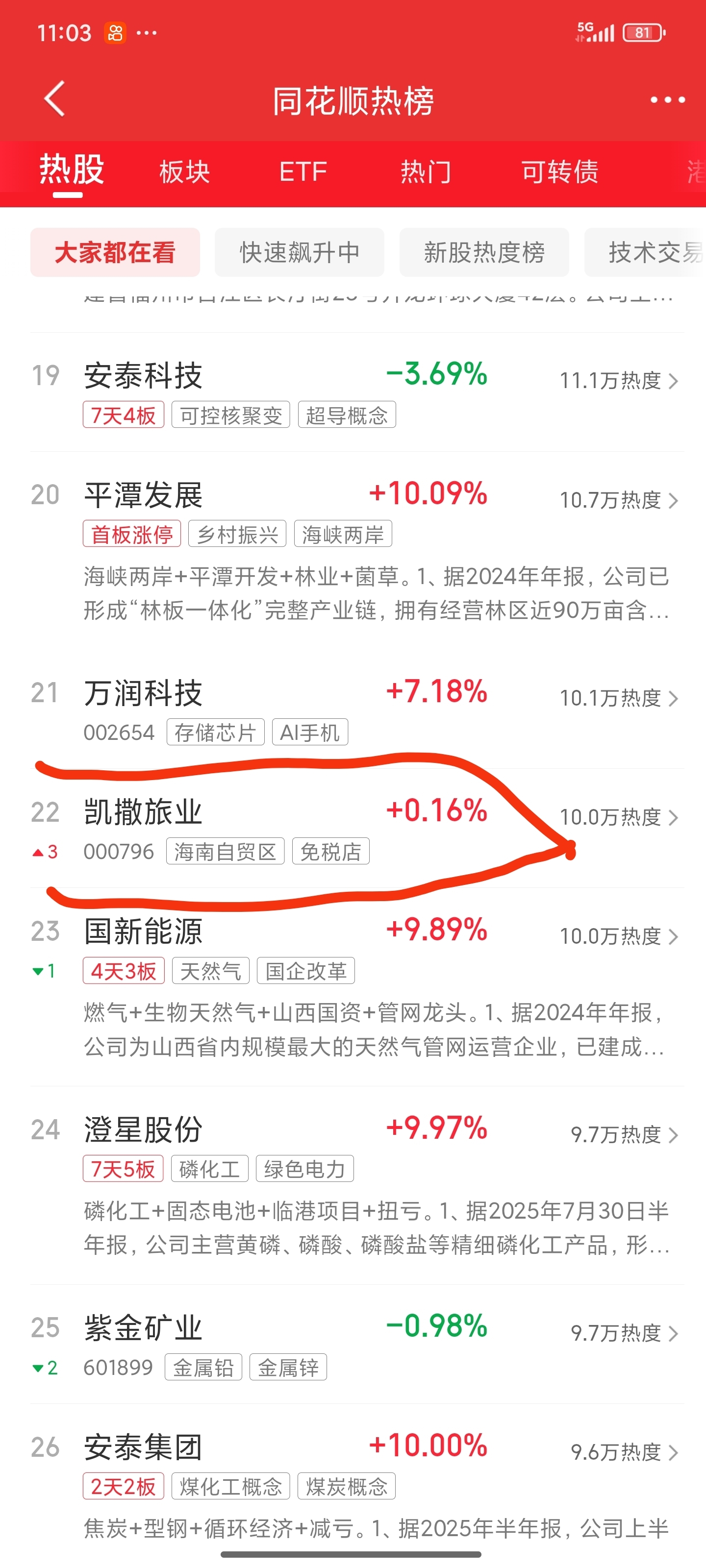 $凯撒旅业(SZ000796)$ 同花顺人气排名22