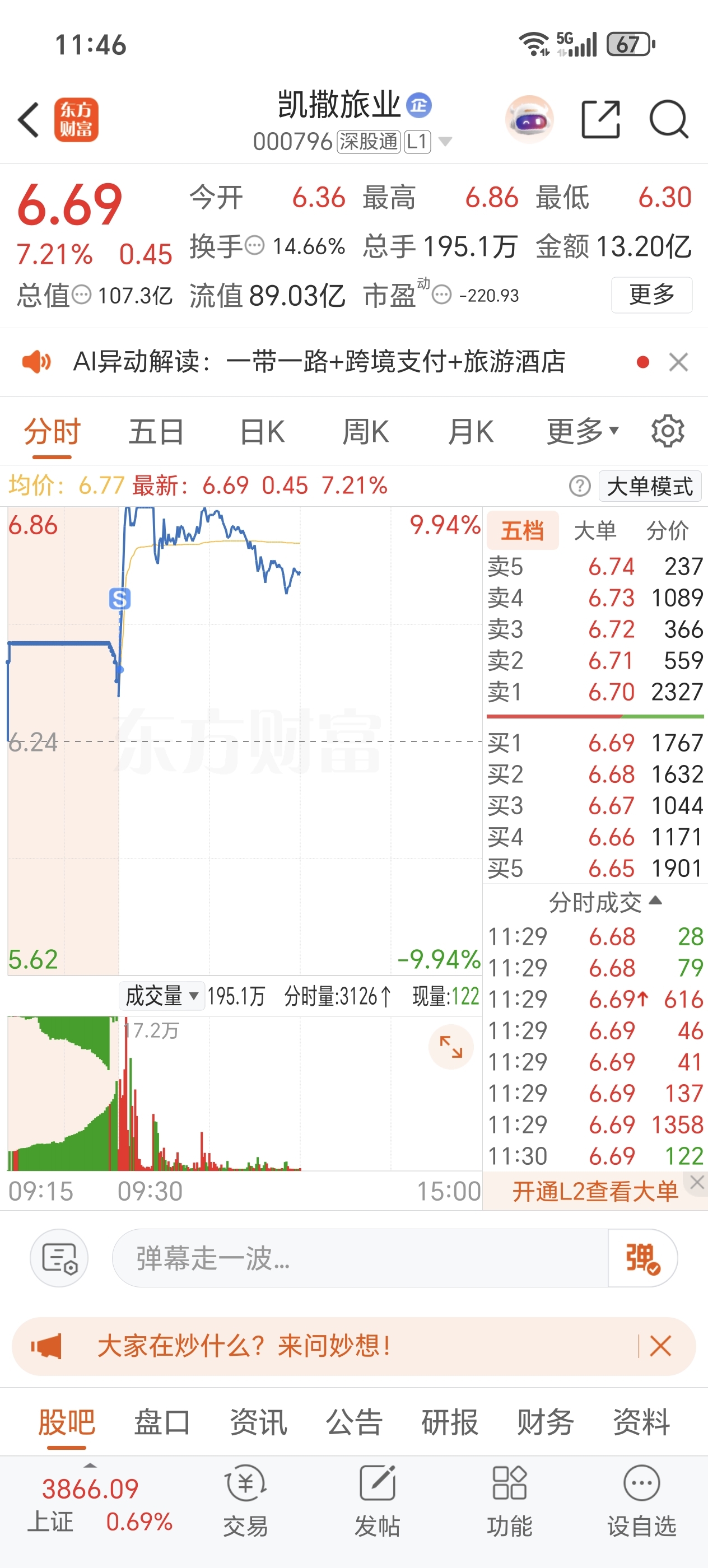 $凯撒旅业(SZ000796)$ 早上你那要死不活的表现让我清了