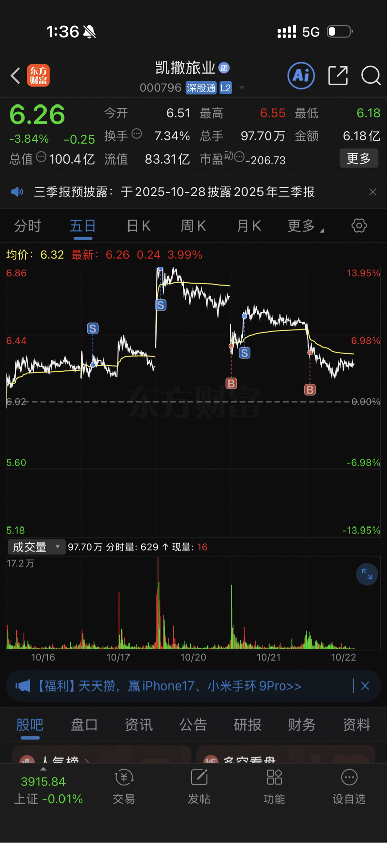 $凯撒旅业(SZ000796)$ 单看五日,他只是不涨不跌。这么说就peace了