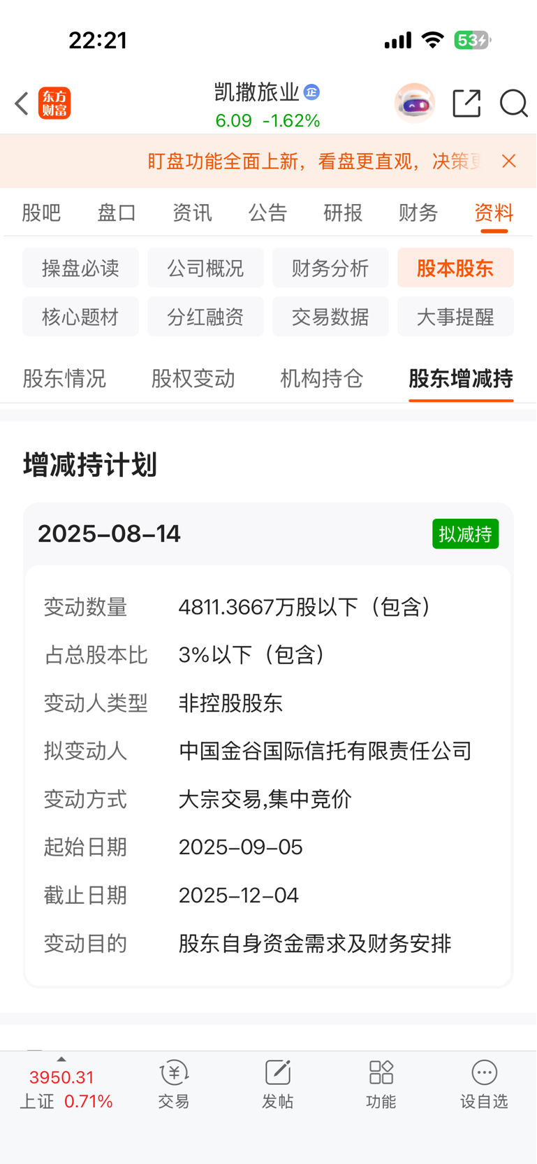 $凯撒旅业(SZ000796)$ 增持计划没有了?也没有公告啥也没有?