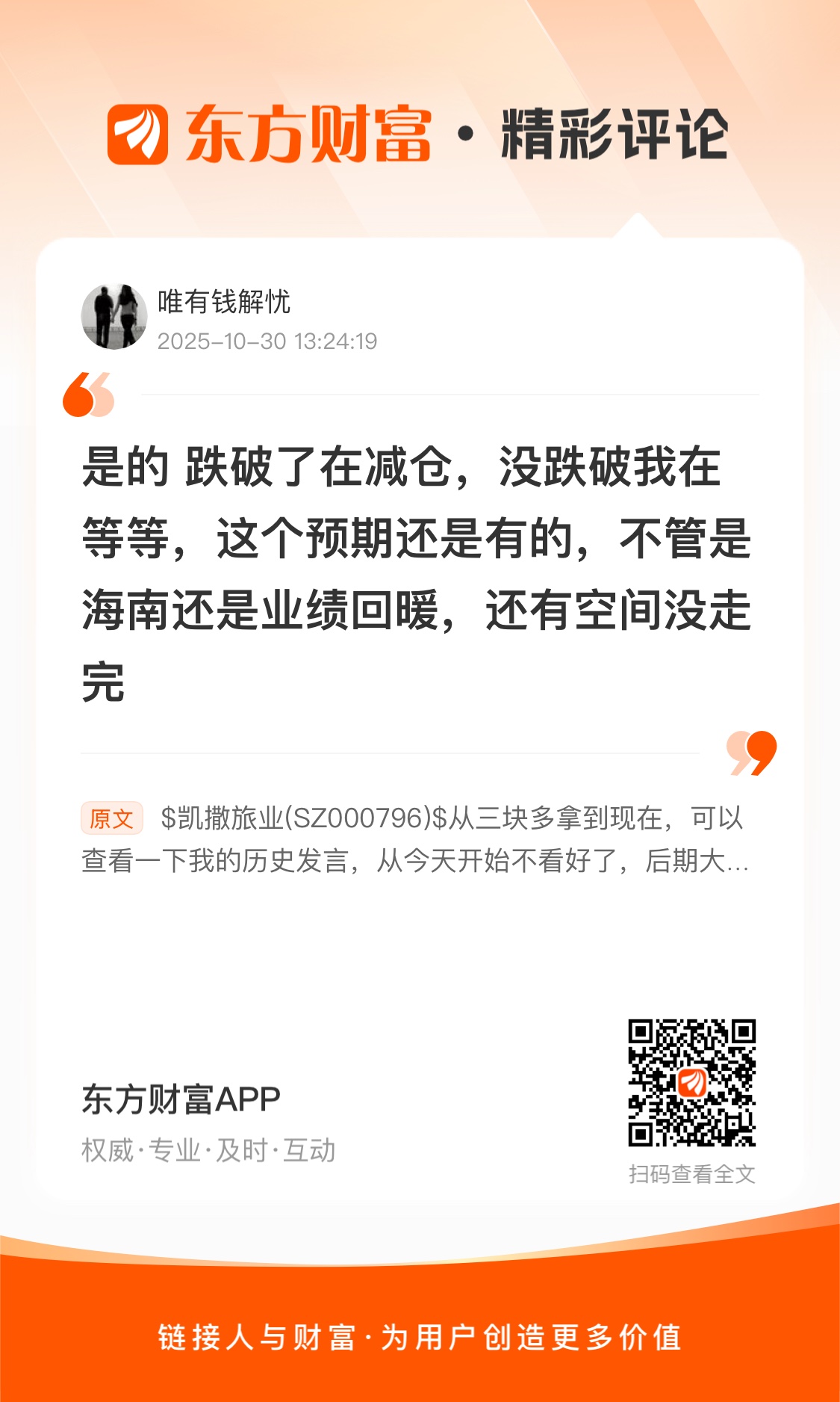 $凯撒旅业(SZ000796)$ 从三块多拿到现在,可以查看一下我的历史发言,从今天开始不看好了,后期大概率要向下了,前期一浪比一浪低,上涨阻力巨大。今天选择出局了,祝大家交易顺利!后会有期!