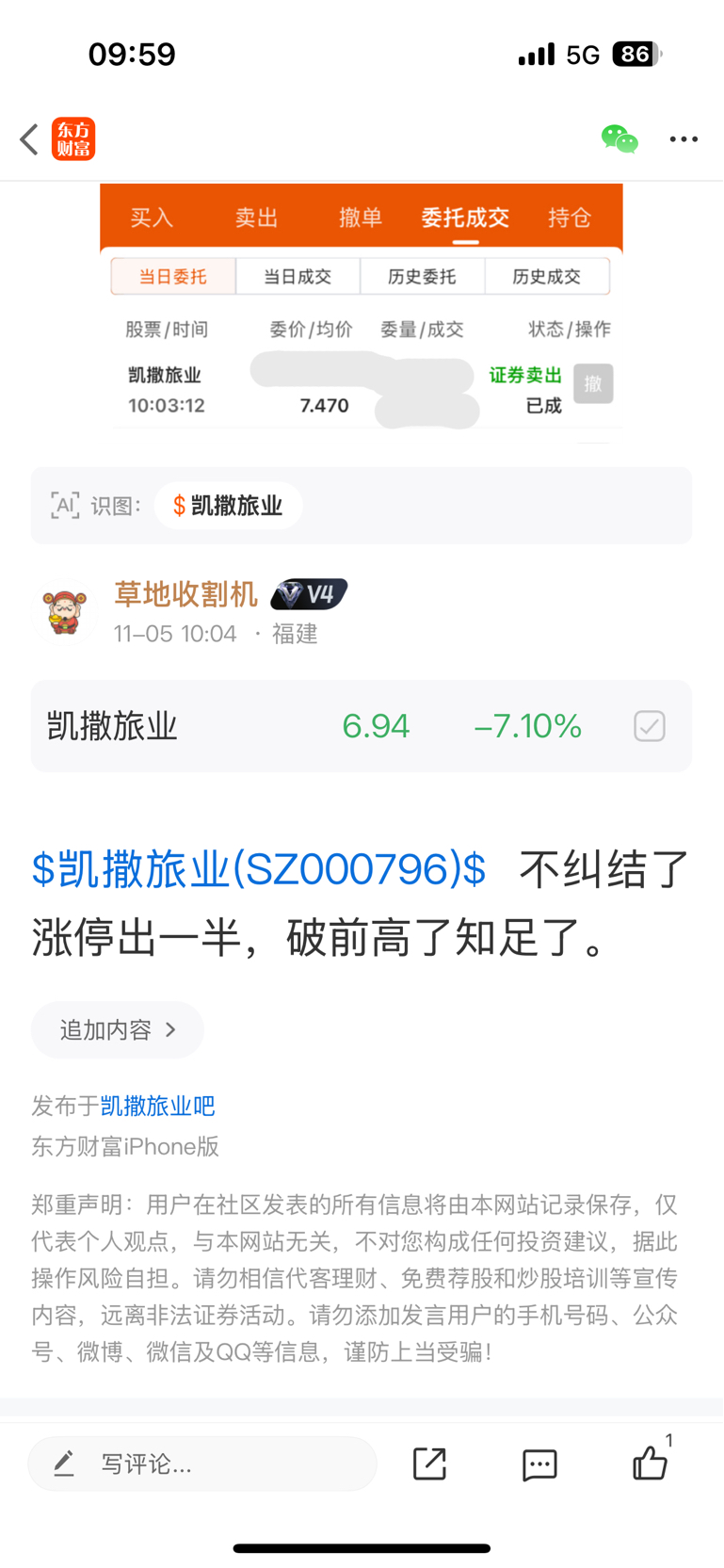 $凯撒旅业(SZ000796)$ 7.37昨天有没有卖,3.65进来的,一路跟着做踢吃肉,今天买回一部分