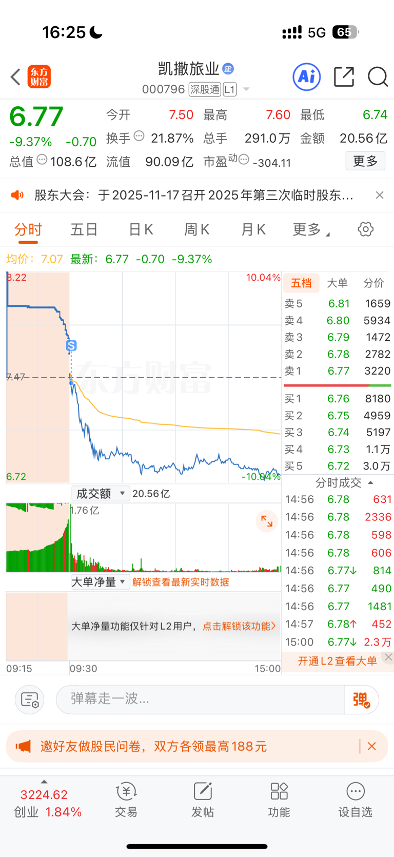 $凯撒旅业(SZ000796)$ 精准逃顶,有没有跟上的。