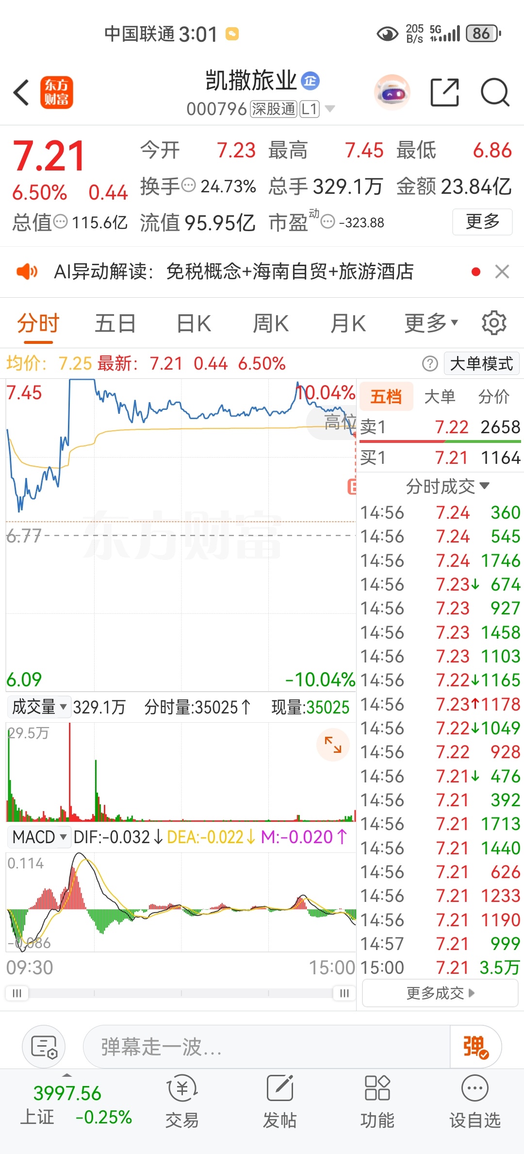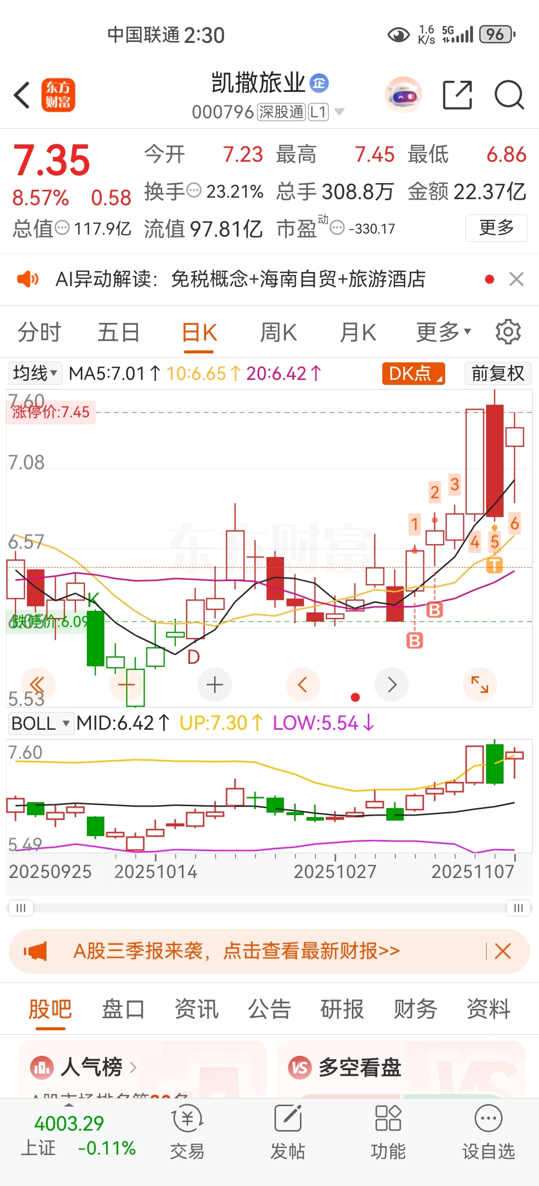 $凯撒旅业(SZ000796)$ 忍不住说两句了,10.31号我进来的,双顶形成看着要爆发,前天涨停后发现主力没连板基因昨天开盘竞价直接逃命,昨天下午收盘2.55接回来。今天千万别涨停,完美的形态,空中加油接力,只要不涨停下周连板,涨停封住了就得挂夜单先跑等调整。前两天看吧里一群喊叫的涨停跌停,感觉乱哄哄的,不过有一句“跨年妖股”感觉挺吹,今天再看结合印证,发现确实有那味了