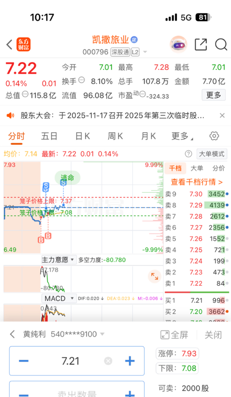 $凯撒旅业(SZ000796)$ 第二笔做踢的7.25卖了,主力你拉涨停吧,我只有2000股了