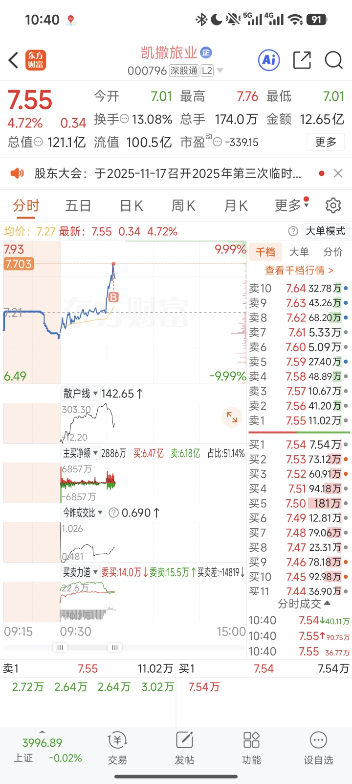 $凯撒旅业(SZ000796)$ 刚才7.3没买,这个买了立马跌。。