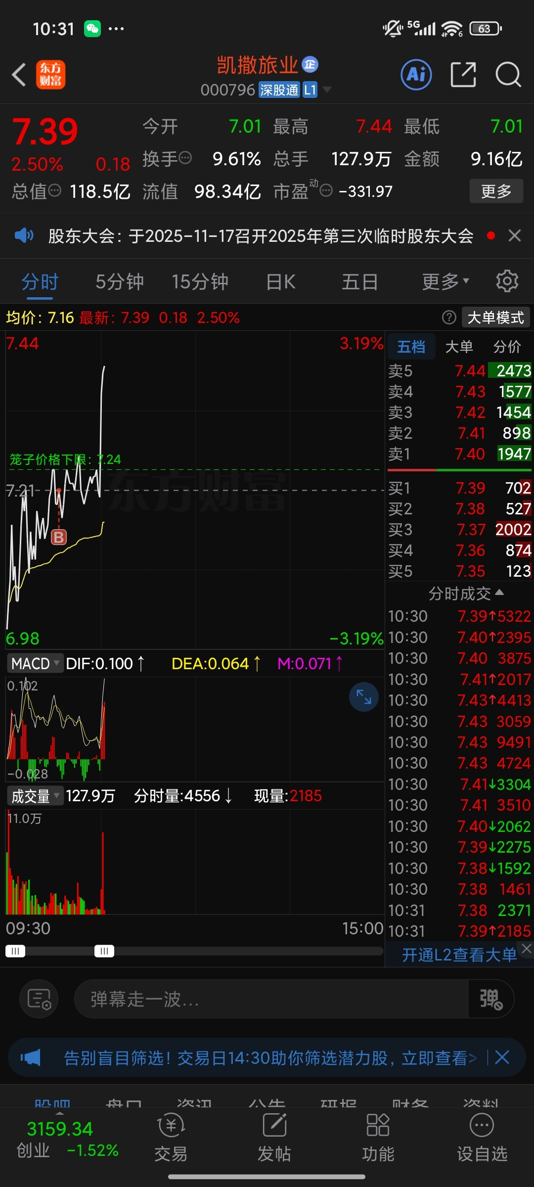 $凯撒旅业(SZ000796)$ 海马涨停,一看要转强,果断加仓。新高只是开始,来日方长,未来可期。