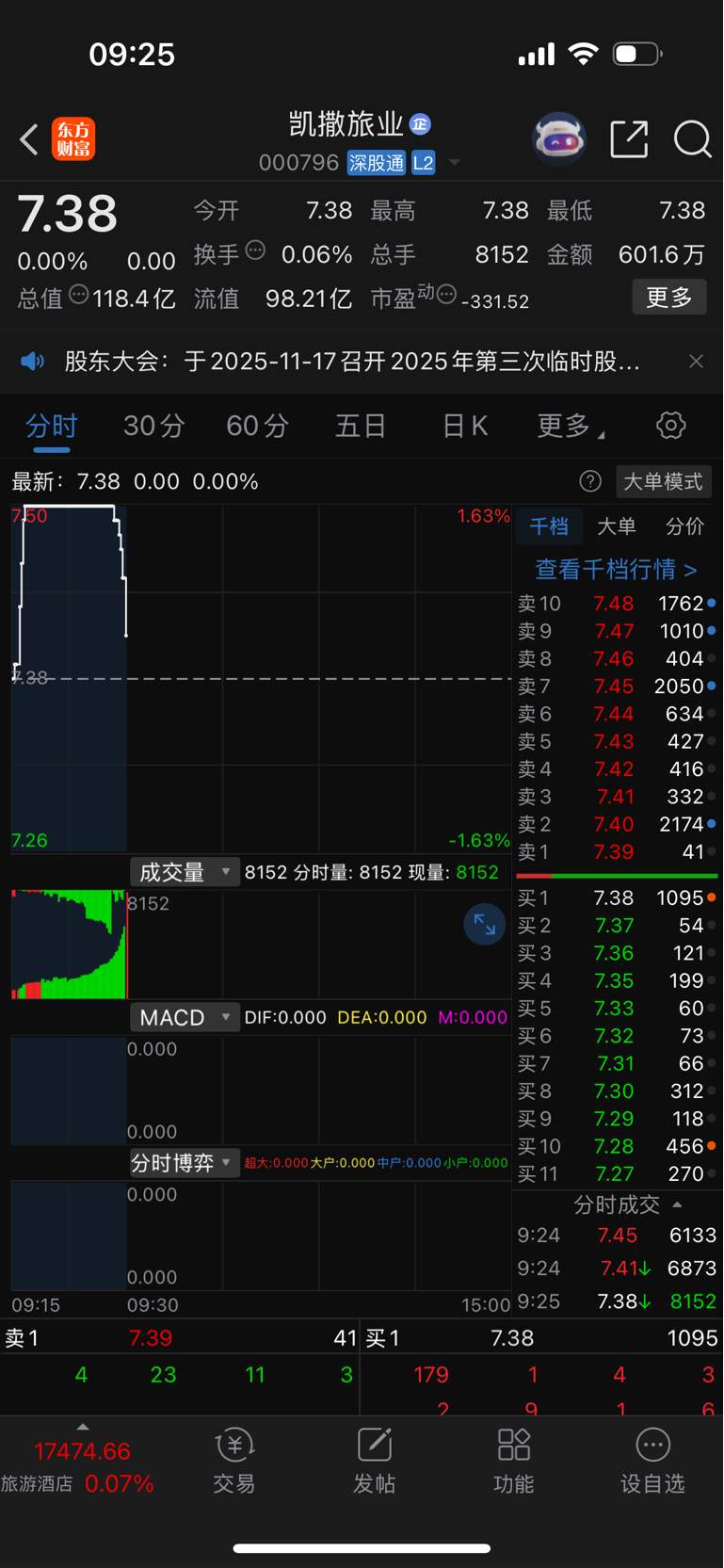 $凯撒旅业(SZ000796)$ 感觉想涨停板竞价