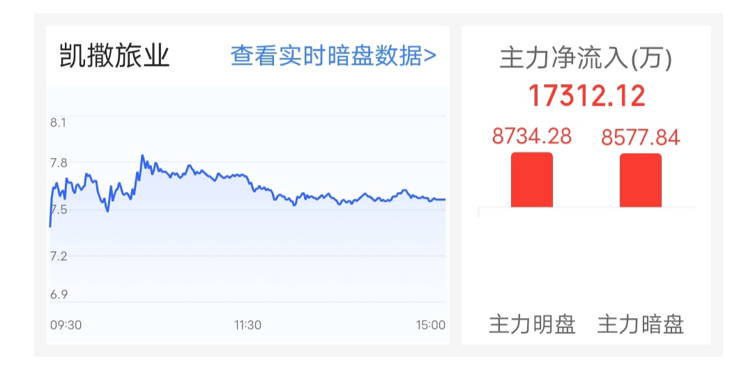 $凯撒旅业(SZ000796)$ 流入1.7个亿,暗盘流入8600万,主力这是想来波大的,今天多少散户割了,明天秒涨停。