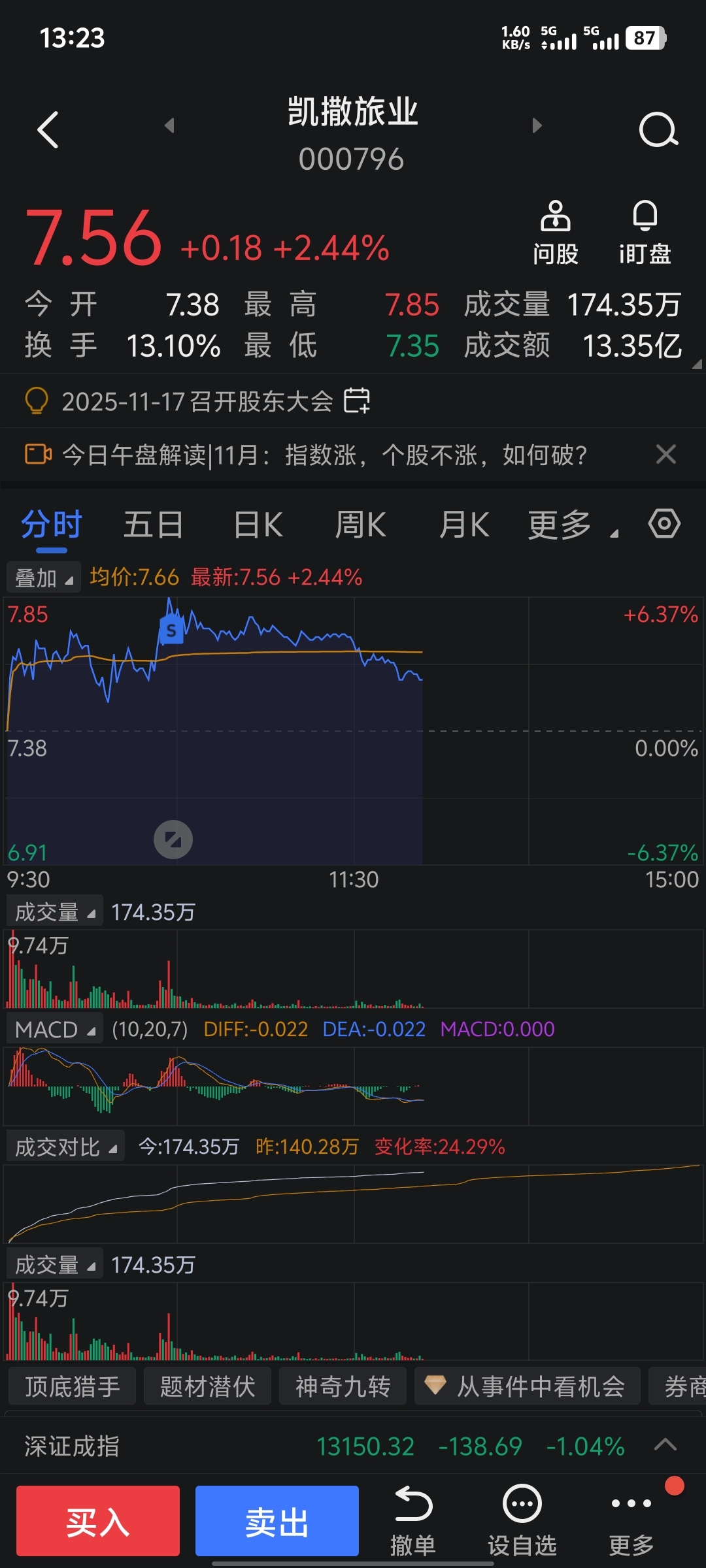 $凯撒旅业(SZ000796)$ 昨天7.80卖了。等待7.10左右进,这样才有利润