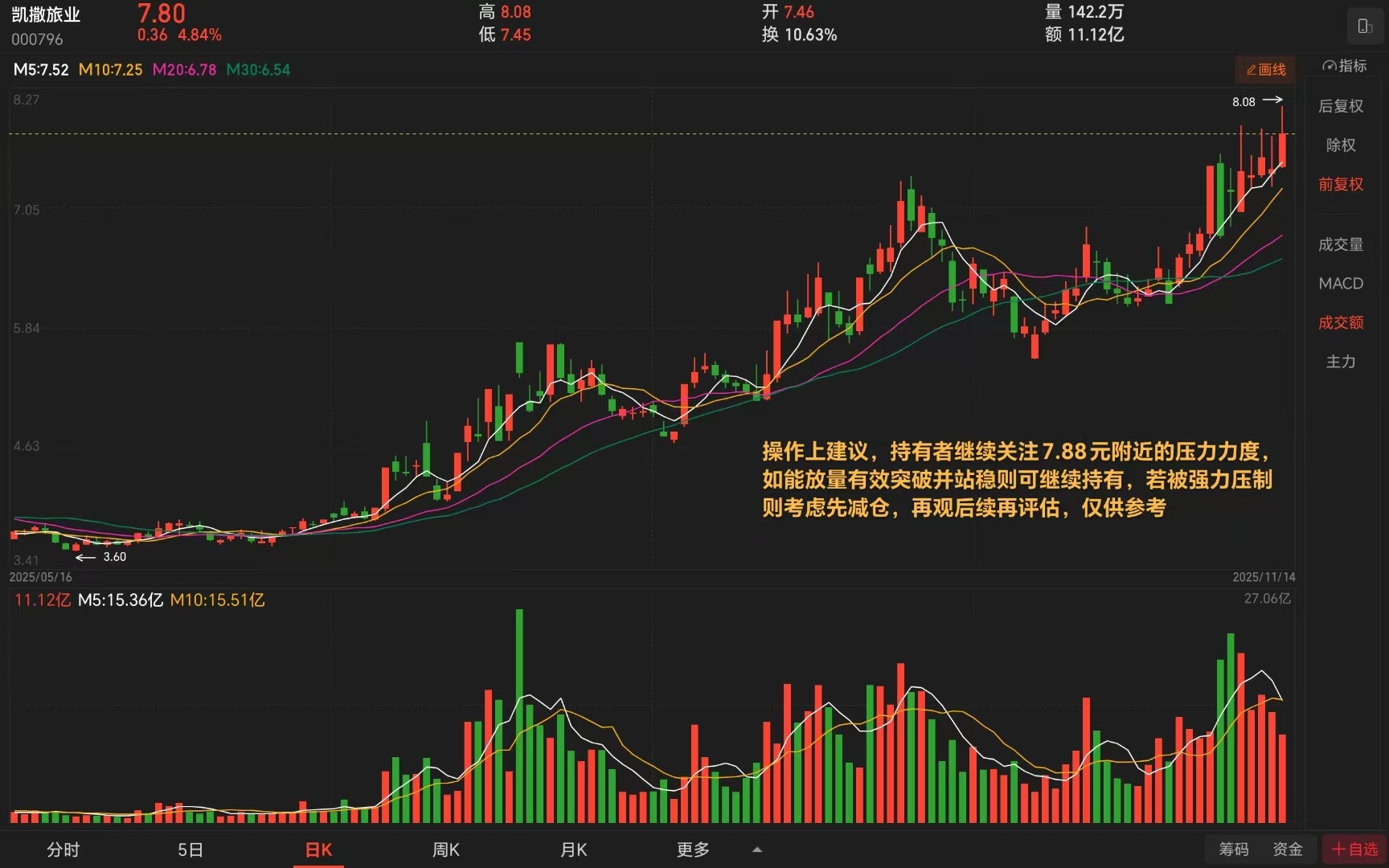 $凯撒旅业(SZ000796)$ 当前5日线,10日线与20日线呈多头排列状态,MACD指标趋好,今日成交额有所放大,股价创出了近期新高,不过受近高点7.88元一线的压力,操作上建议,持有者继续关注7.88元附近的压力力度,如能放量有效突破并站稳则可继续持有,若被强力压制则考虑先减仓,再观后续再评估,仅供参考。