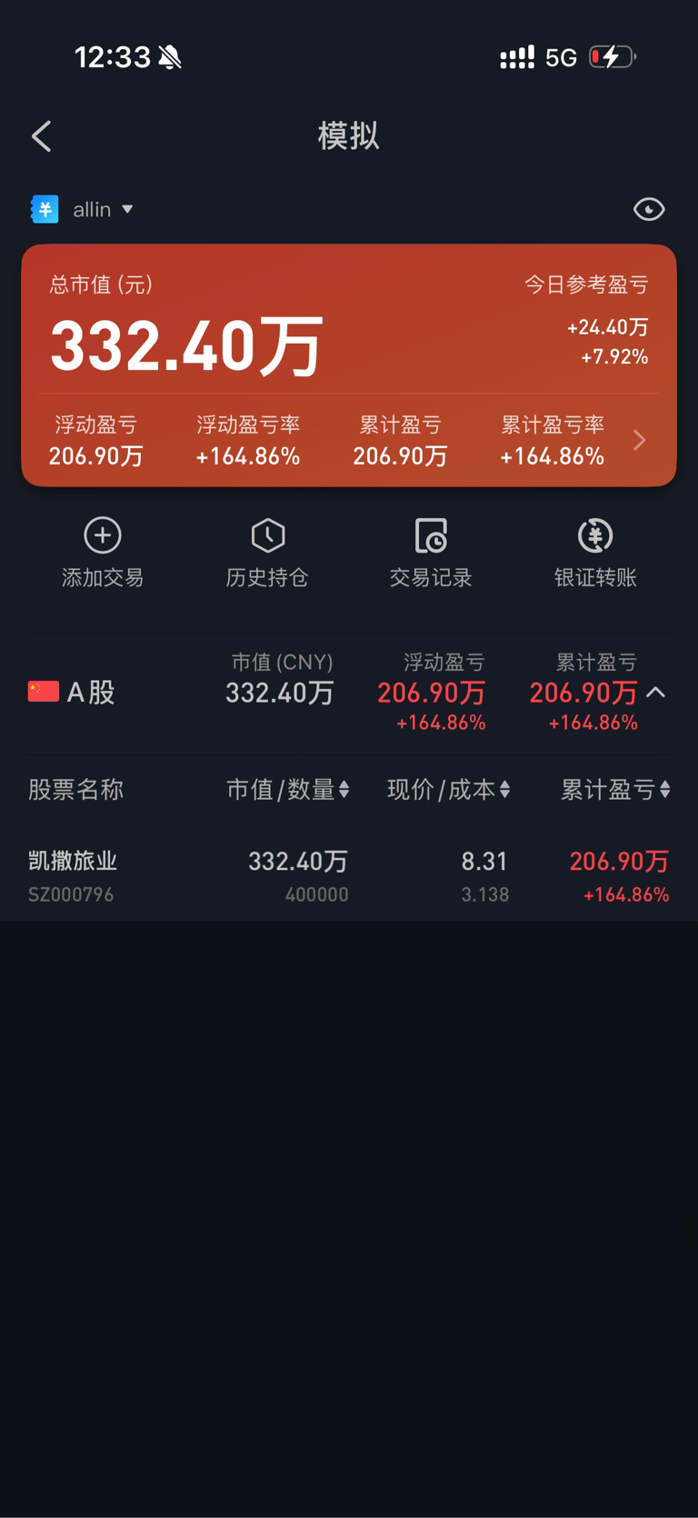 $凯撒旅业(SZ000796)$ 感谢凯撒让我模拟盘再创新高,买入之后不做任何操作