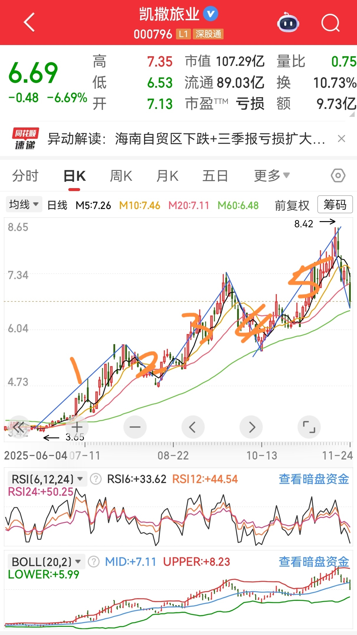 $凯撒旅业(SZ000796)$ 明显5浪结束了,6.5左右进的短线做多到7.1,搏个B返就撤退了。海南板块资金也退潮了,也别梦想着封关了都炒了好几轮了,目前该股风险大于收益,听光哥的,认栽撤退吧。外面这么多好的票就别在这里了。