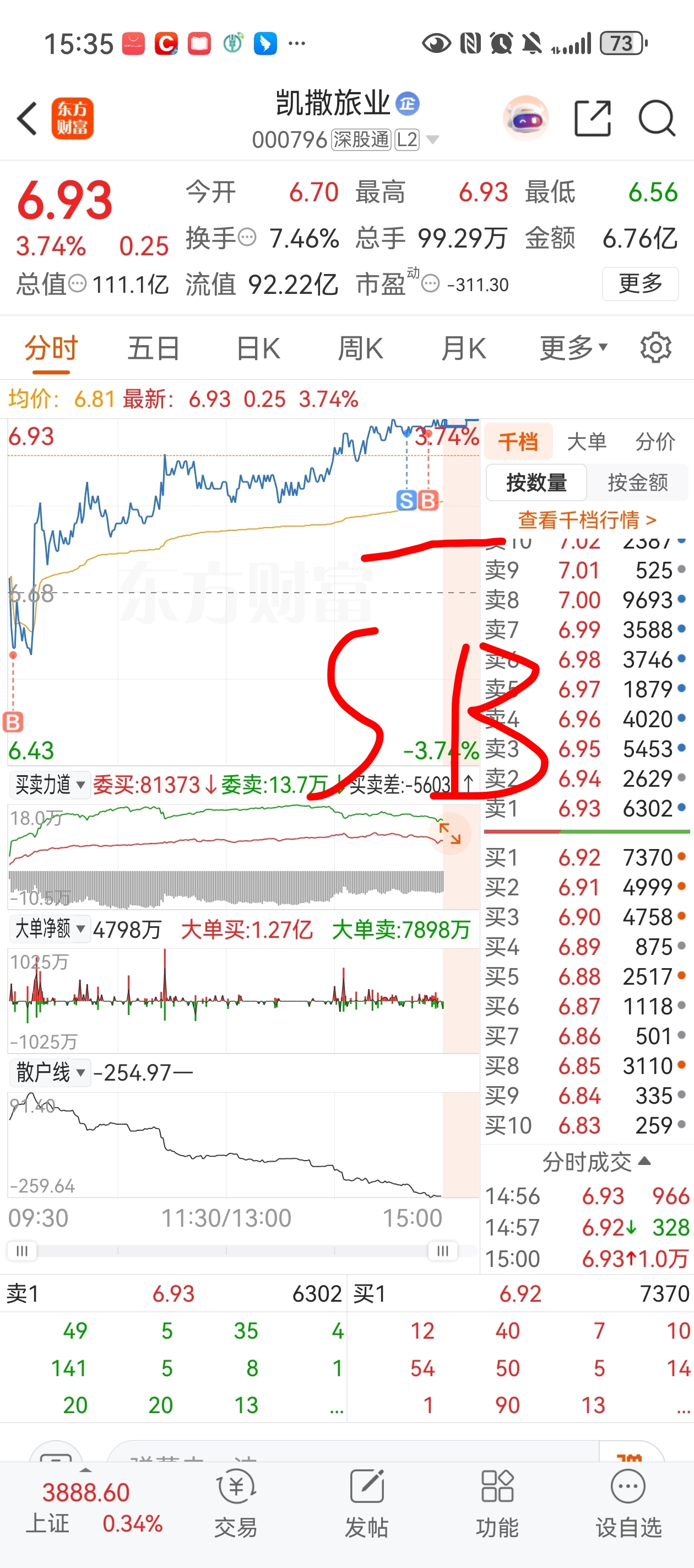 $凯撒旅业(SZ000796)$ 我有点SB啦,6.59买进,6.92卖掉,3毛的踢,看到6.91有1.2万手,弹幕都说有踢飞的,我傻乎乎的又挂单买进去了,我一看SB,好无语真是一个sb