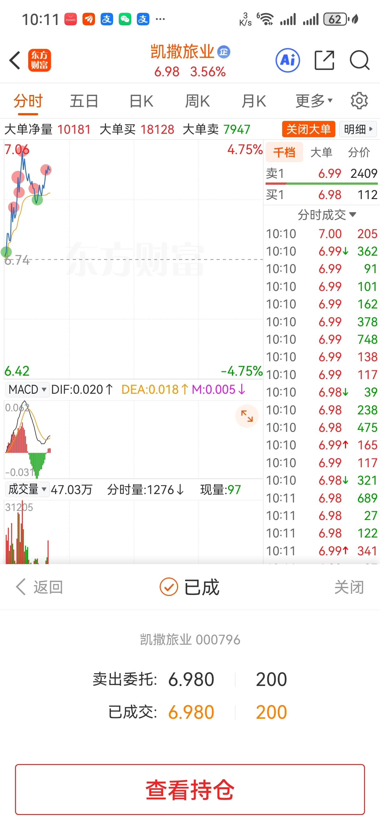 $凯撒旅业(SZ000796)$ 出货200股完毕