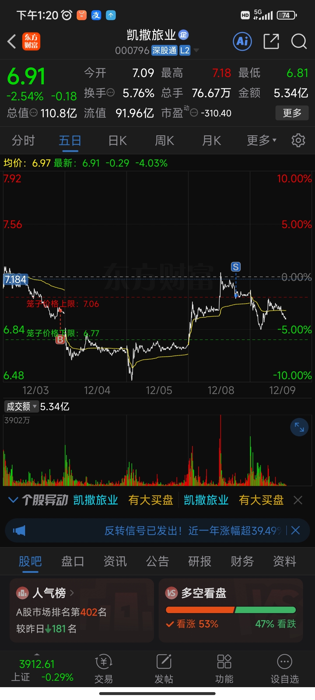 $凯撒旅业(SZ000796)$ 这个票好危险,感谢主力,我昨天已经走了