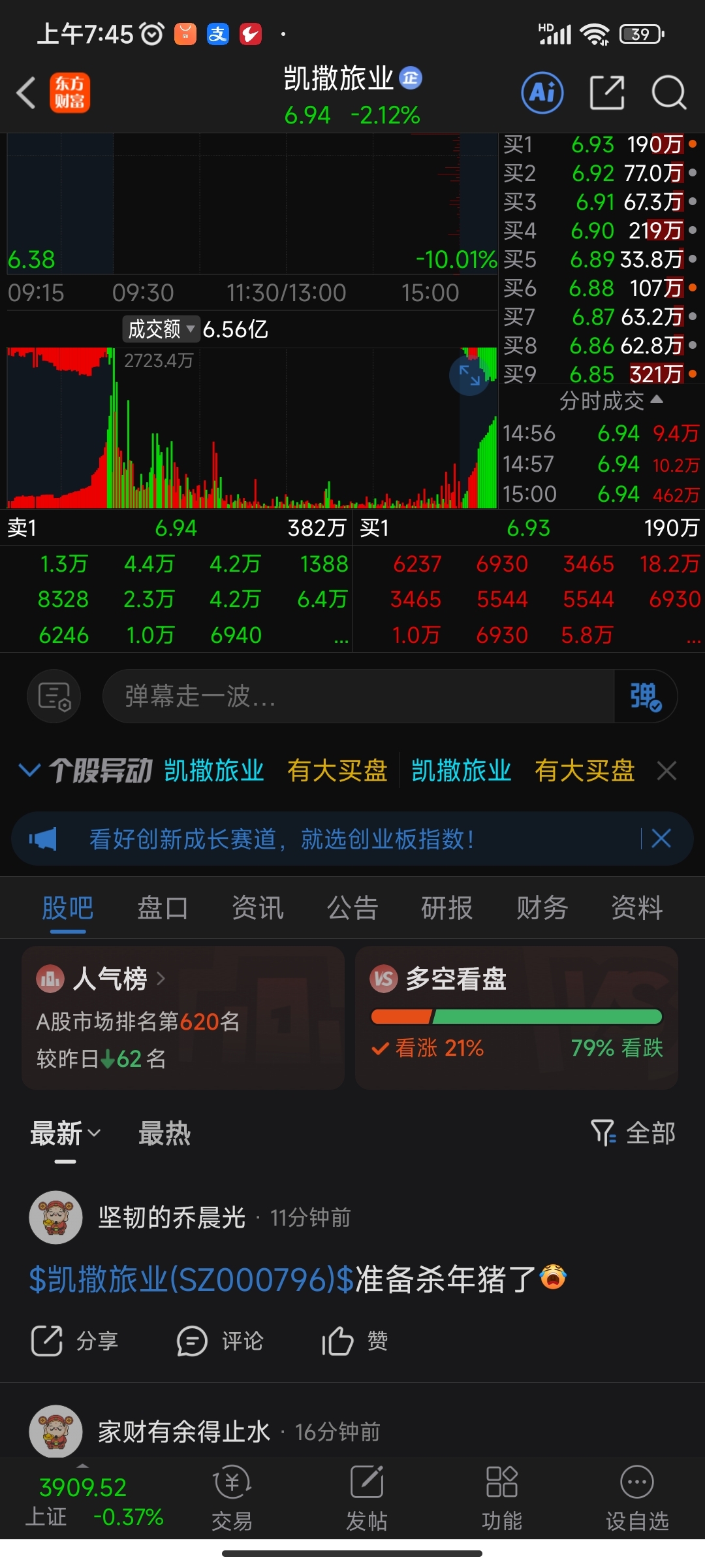 $凯撒旅业(SZ000796)$ 今天只有21%看涨,又是一碗大面