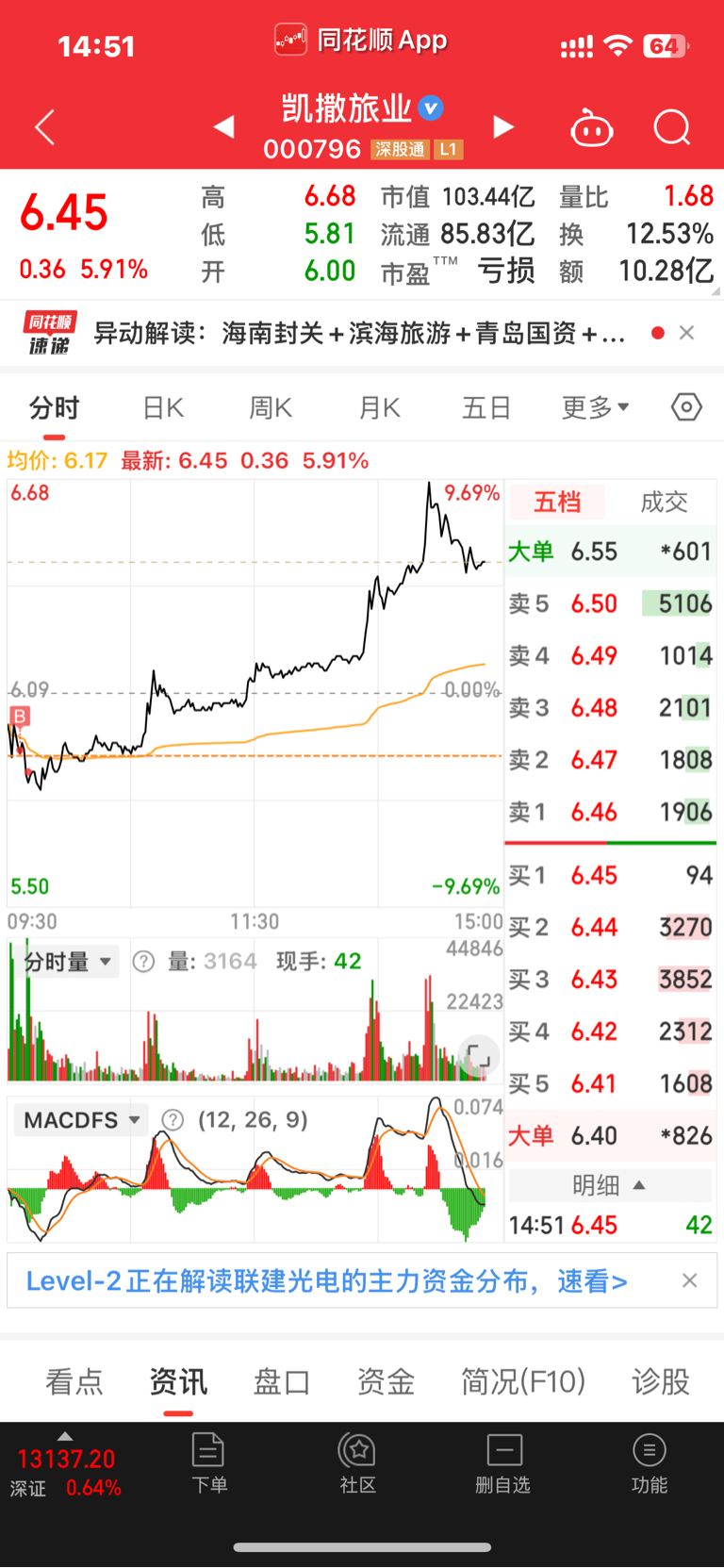 $凯撒旅业(SZ000796)$ 6.5收盘