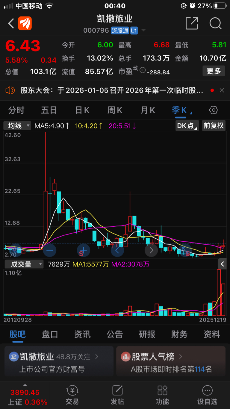 $凯撒旅业(SZ000796)$ 大家从来不看季线?